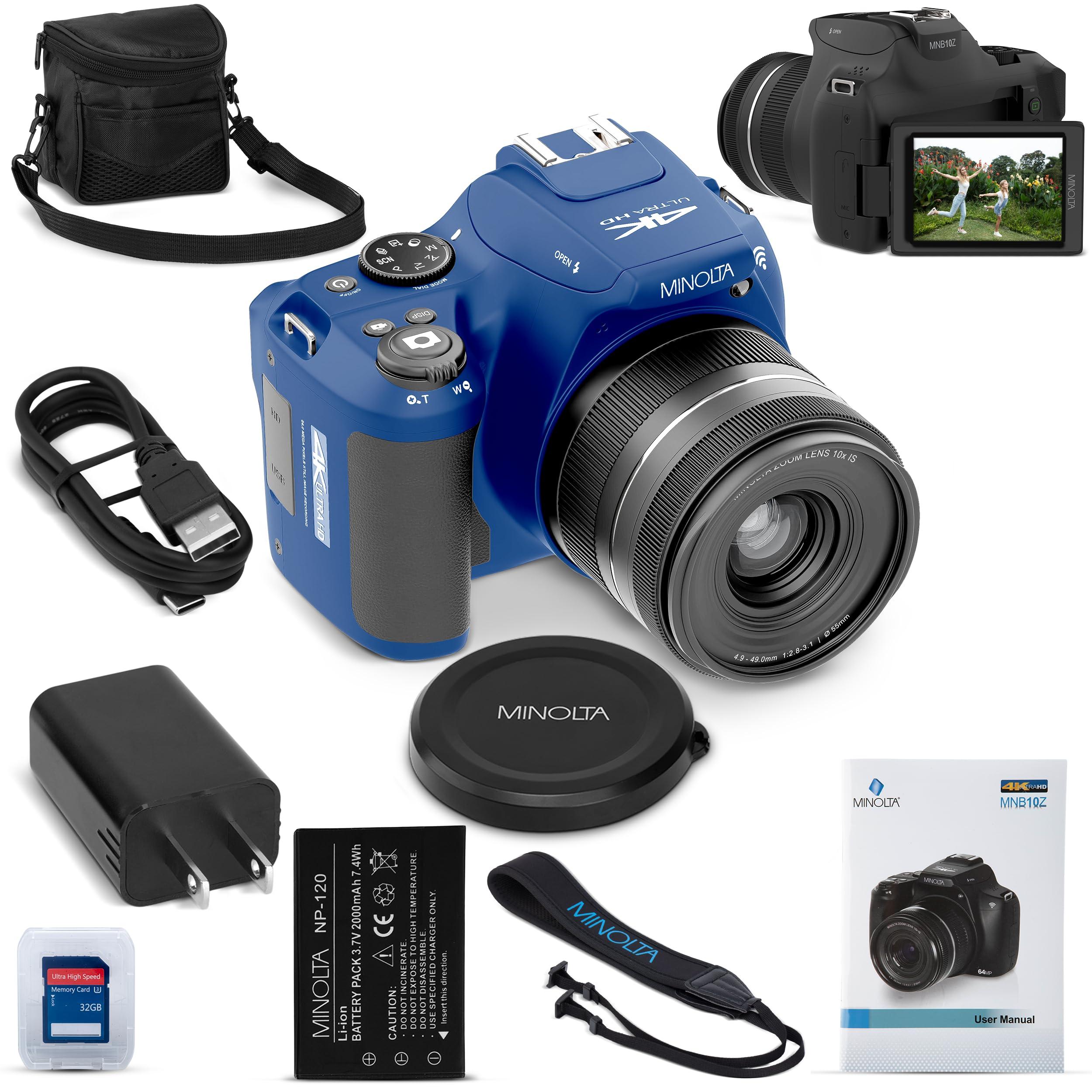 Step up your photography game with the Minolta ProShot 64MP Auto Focus Digital Camera, a high-performance camera built for creators who want clarity, control, and creativity in a compact design. Whether you're capturing your next adventure, family event, or creative project, this feature-packed camera offers outstanding value and results. Take stunning 64-megapixel still images using the advanced CMOS sensor, delivering incredible sharpness, detail, and color accuracy that holds up even when cropped or enlarged. For motion, record smooth, cinematic-quality 4K Ultra HD video, ideal for vlogs, travel recaps, and action footage. From wide shots to tight zooms, the 10x optical zoom lens brings you closer to the action without sacrificing image quality. When shooting subjects up close, macro mode captures texture and detail with stunning precision. You can also shoot dynamic burst mode sequences or create dramatic time-lapse videos, capturing hours of footage in a few impactful seconds. The camera features digital and optical anti-shake stabilization to reduce blur from hand movement, so your photos stay crisp even when handheld. Face detection, scene selection, and intelligent auto mode help take the guesswork out of your settingsperfect for users who want great results fast. Framing is easy with the 3.0-inch LCD screen, and the camera includes a built-in accessory shoe mount to attach an external microphone or LED light. Use the integrated Wi-Fi connectivity to transfer files or control the camera remotely with your smartphone. The Minolta ProShot also includes everything you need to start shooting right away: a 32GB SD card, USB cable, rechargeable lithium battery, battery charger, and a carrying case for protection and portability.