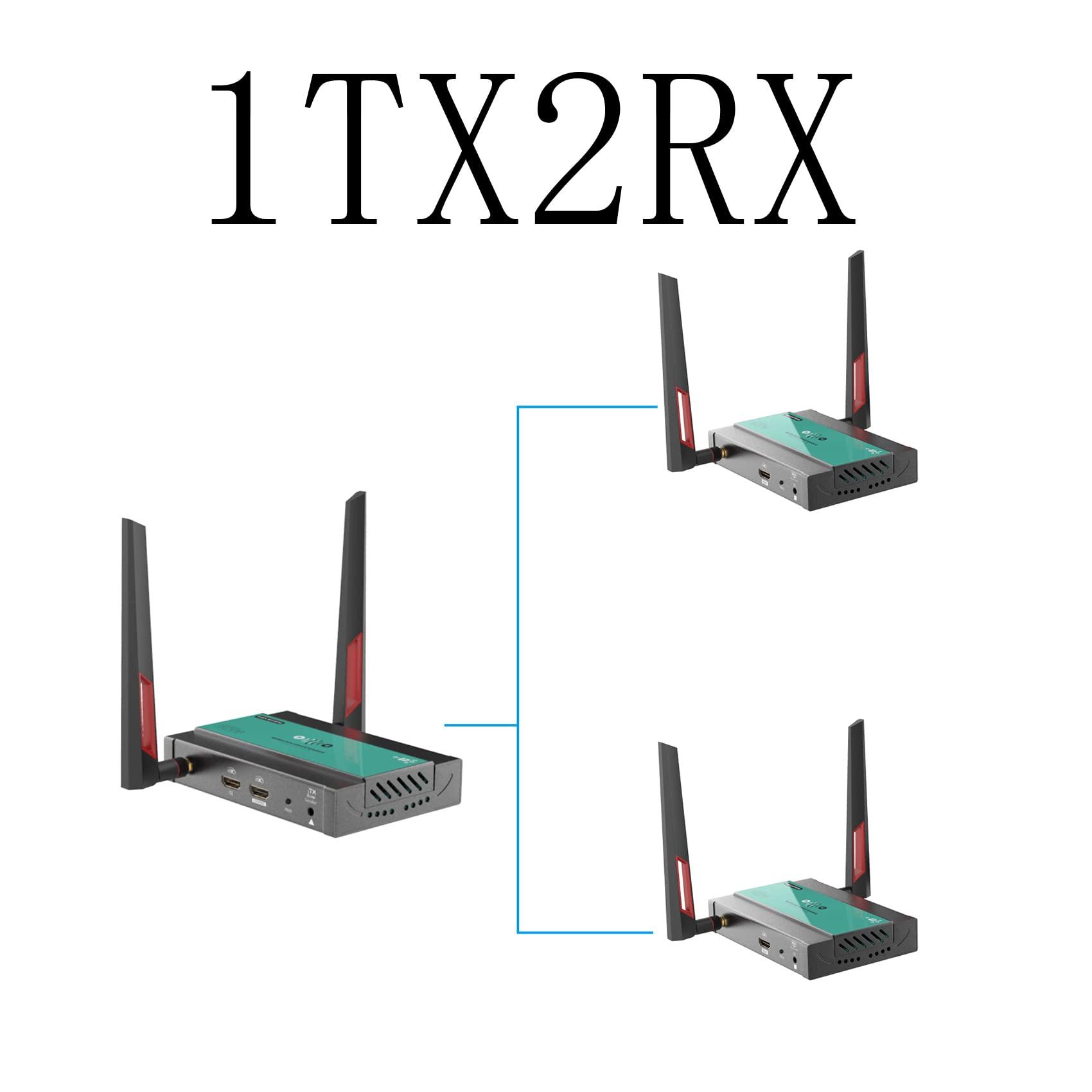 - This is 1TX2RX setSupport 1TX to 4RXs(Max)This wireless hdmi trasnmitter and receiver can support 1TX to 4RXs(Max),you can add more RXs as you need.Buy more RXs from this ASIN:B0B586LDTW .Noted:With the increase of RX, the wireless transmission distance will become shorter.Theoretically,line of sight wireless transmission distance: 1 TX to 1 RX: 200m(656ft); 1 TX to 2 RX: 60m(196ft); 1 TX to 3 RX: 40m(130ft); 1 TX to 4 RX: 30m(98ft).