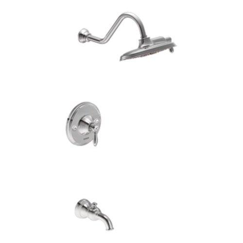This package features a single lever design for easy of use and a 6-3/4-inch tub spout. The 9-inch rainshower showerhead offers Moen's Immersion technology and offers full spray and concentrated rinse functions. Water flow is limited to a maximum of 2.5 gallons per minute (gpm).
