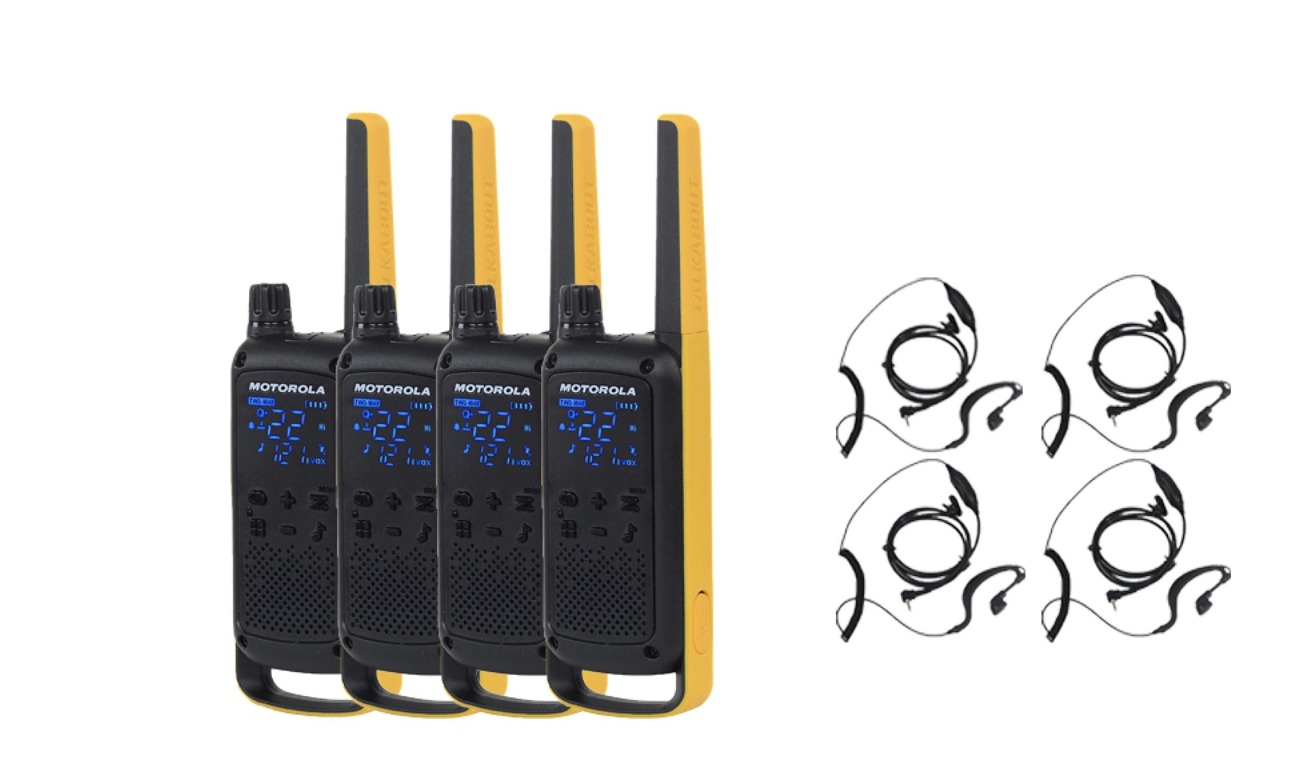 - Package Includes: 4 Radios, 4 Rechargeable Batteries, 4 Belt Clips, 2 Dual Chargers, 4 - Curl PTT Earpieces, 32 Personalized Stickers,
