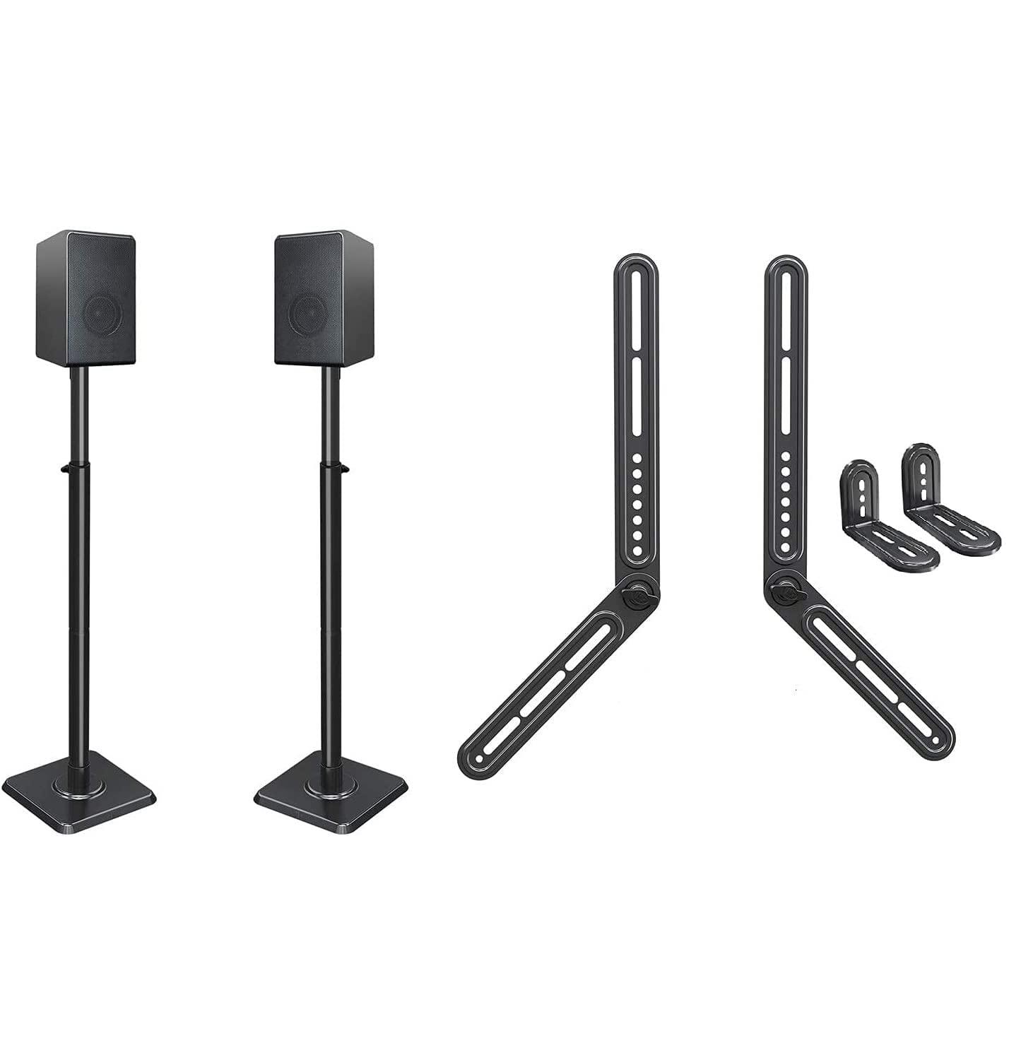 Mounting Dream Speaker Stands for Small Bookshelf Speakers Set of 2 Floor Stand Mount 11LBS Capacity, MD5420 Soundbar Mount Above or Under TV with Detachable Extended Plates Fits Soundbar up to 22lbs