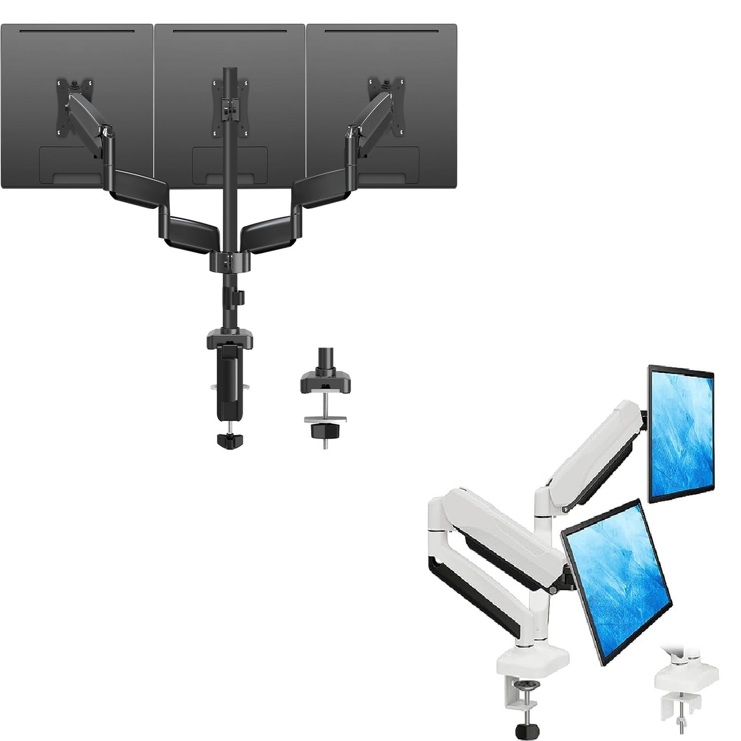 - Space Saver & Clutter-Free Desktop: Save more than 80% desktop space to place office accessories compared to three individual monitor stands with base. Concealing cables through detachable cable cover and clip, hiding sore eyes wires clutter, improve office comfort. Tips: If your table is thin, we recommend mount with reinforcement plate (not included) to avoid damage to the table.