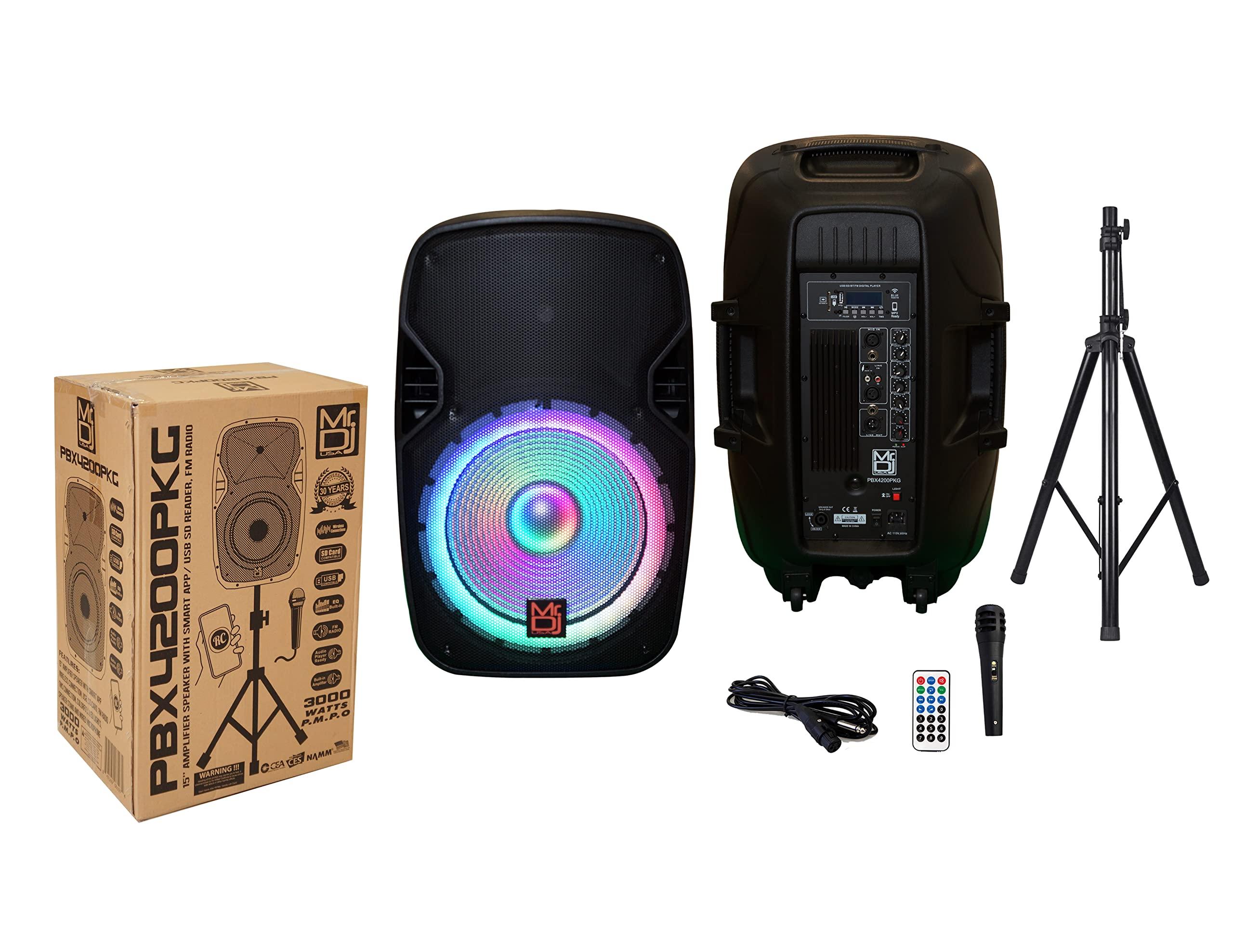 - Mr. Dj PBX-4200PKG 15" Powered PA DJ Speaker, 3000 Watt 2-Way Full Range Portable PA Speaker System Combo Set With Stands/Illuminating Light/Microphone/EQ/USB/Bluetooth