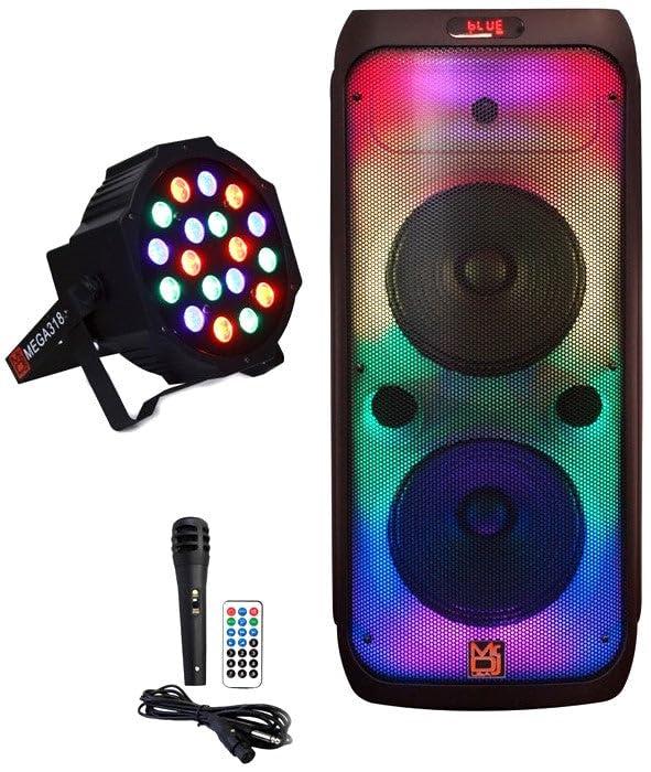 - MR DJ USA FLAME4200 10" X 2 Rechargeable Portable Bluetooth Karaoke Speaker with Party Flame Lights Microphone TWS USB FM Radio + 18-LED Slim Par Wash DJ Light