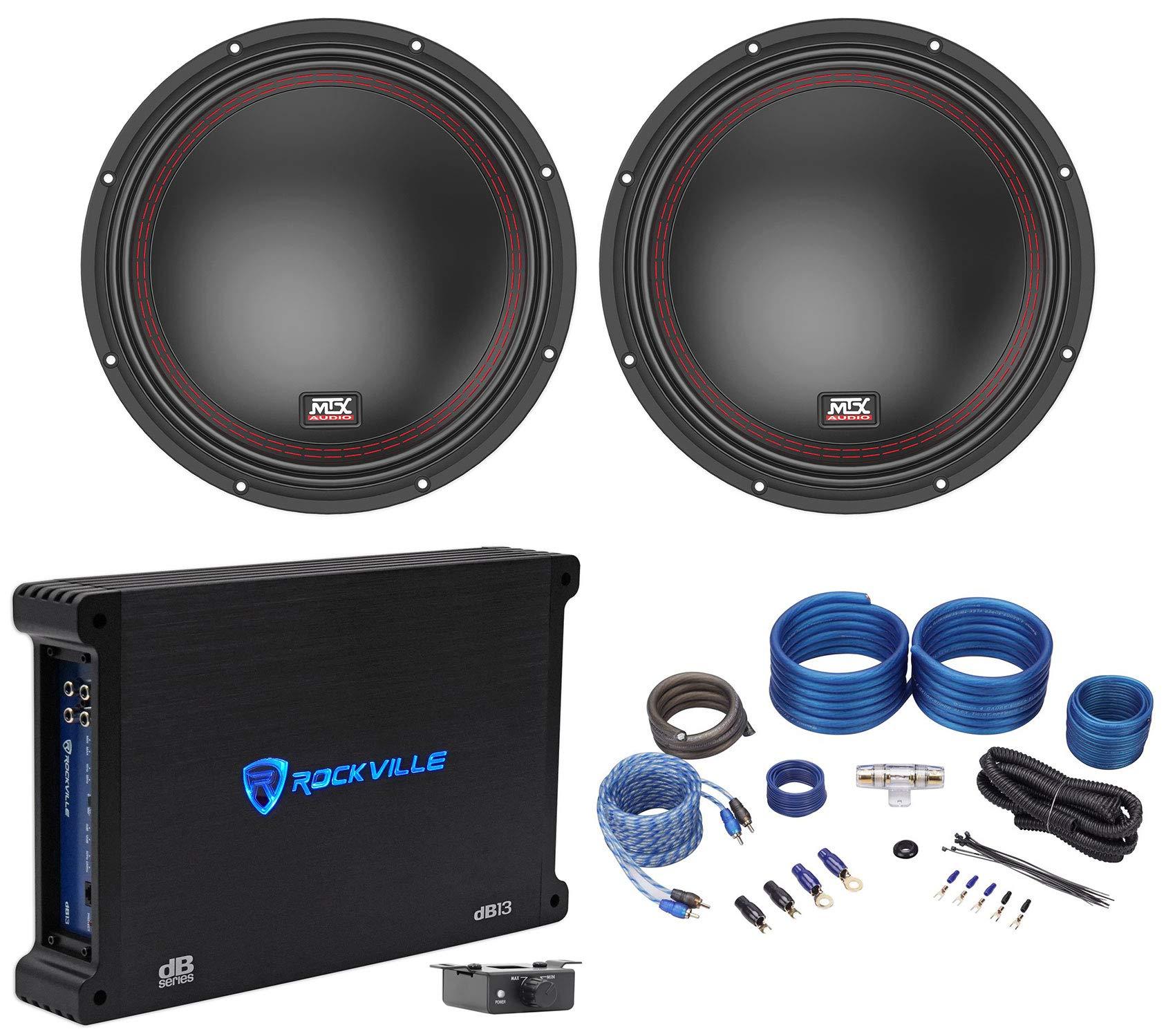 MTX (2) 5510-22 10" 800 Watt Peak/400 Watt RMS DVC 2-ohm Car Subwoofer Bundle with Rockville dB13 3000 Watt Peak/750w RMS Mono 2 Ohm Car Amp and RWK41 4 Gauge Car Amp Wiring Kit (4 Items)