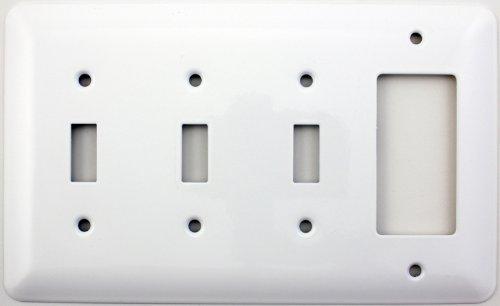This switch plate is made of stamped steel that is painted white. It has a smooth, glossy finish to it to simulate porcelain. The style of the plate is called Princess because of its rounded corners and bevels. This wall plate is a four gang switch plate that will accommodate three standard toggle light switches and one standard GFI electrical outlet, rocker light switch or any other rocker opening devise. Plate measures 5" by 8 1/4"