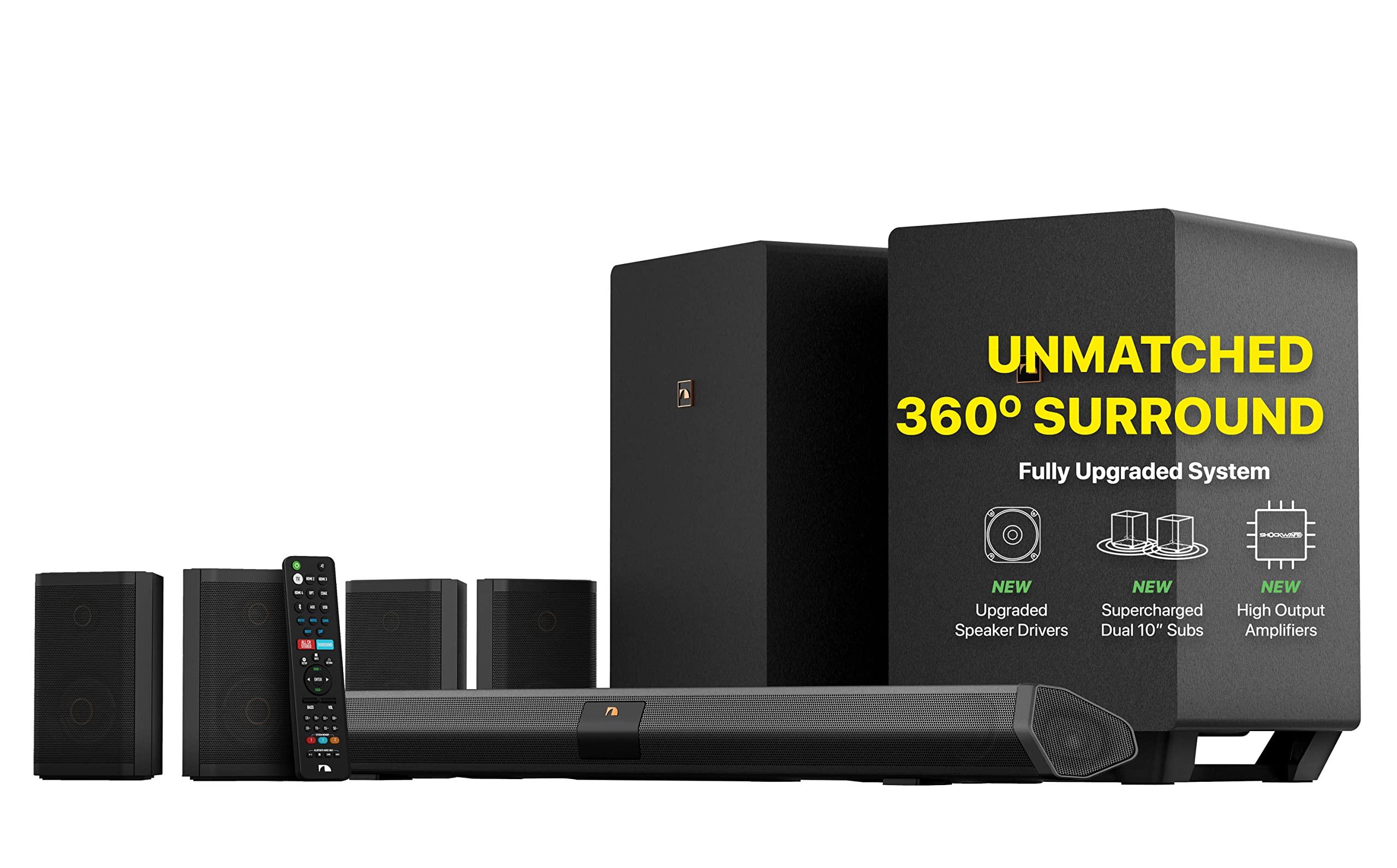 - SUPERCHARGED DUAL 10 WIRELESS SUBWOOFERS (INDUSTRY-EXCLUSIVE) propel bass performance to new heights, featuring upgraded high output amplifiers (up to 600W) and subwoofer drivers that harness effortless power, transforming your entire room into a sweet spot filled with thunderous, yet balanced lows as deep as 20Hz without any localization or distortion even at cinema-level volumes. Real bass is felt, not heard. Our system showcases TWO subwoofers which are a must for the ultimate home theater.