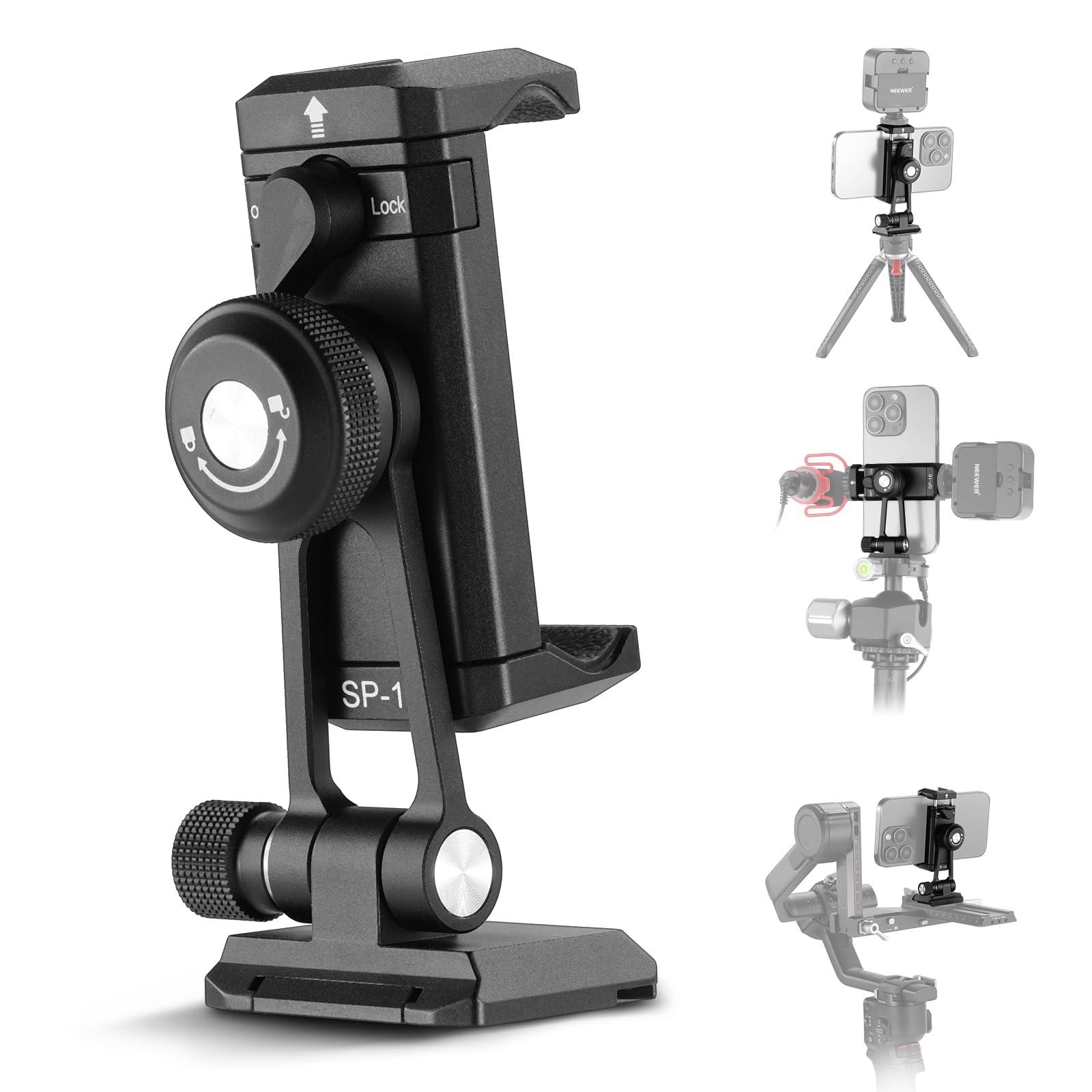 - 1/4" 3/8" Threads & Cold Shoe Mount The 1/4" and 3/8" mounting threads below the Arca type base can be connected to tripods, monopods, light stands, table stands, and handles to take sharp images and videos. The tripod phone holder has two cold shoe mounts to attach LED video lights, RGB lights, microphones, etc.
