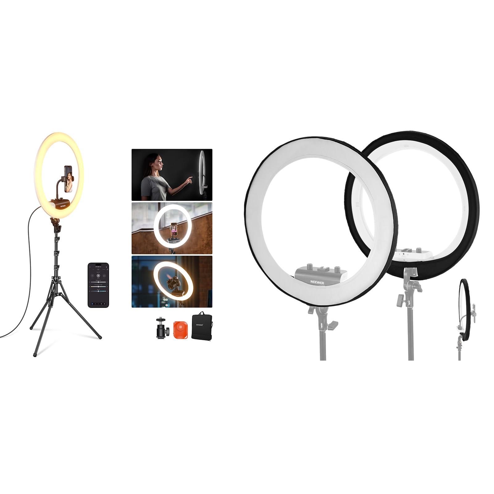 - Pro Version 18 inch Ultra Thin Ring Light with Diffuser At just 0.7"/1.8cm thick, this versatile ring light fits snugly in compact spaces, and on the go setups. Its distinct outer shell adds a unique touch, setting your setup apart. A carrying bag with an ergonomic design ensures safe transport, featuring a well organized internal structure for both light and stand. Apart from the included DC power, you can extend outdoor power with the separately sold NEEWER PS010E NP-F battery kit.