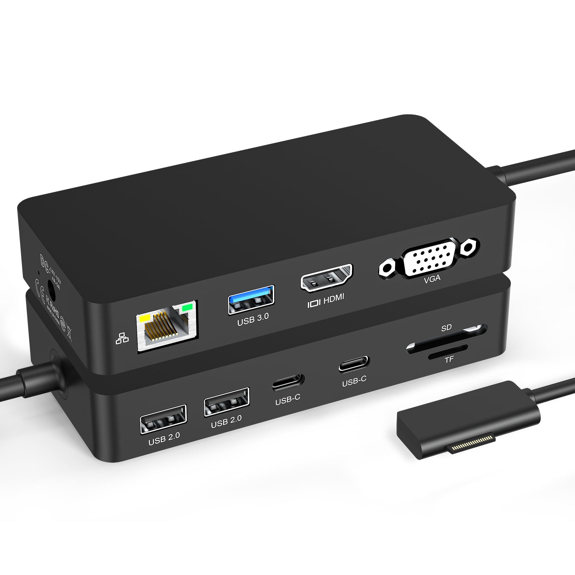 - 11-in-1 Multi-Functional Surface Dock Station: The surface docking station uses surface connection technology, which has high-speed transmission of video, audio and data keep your desktop tidy. 11-in-1 Triple display Microsoft surface Pro dock equips with 4K@60Hz HDMI ports, VGA port, RJ45 port, 2x USB C Data port, 3x USB Ports, SD/TF Micro SD card slot, DC Power Port. Surface dock With simple plug and play connectivity.