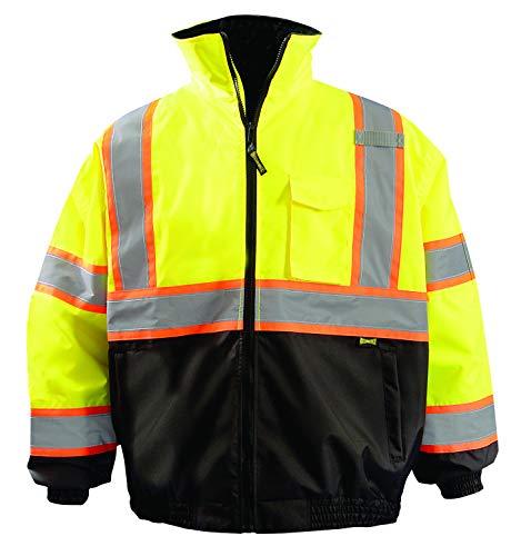 OccuNomix Class 3 black bottom 2-in-1 two Tone Bomber jacket. Wear jacket without the lining as a windbreaker. 300 denier polyester oxford with PU coating-waterproof with sealed seams. Easy on and off Zip-out quilted lining. Fleece lined collar with roll-away hood. Front zipper closure with inside storm flap. 7 pockets: 1 easy access chest pocket, 2 pen/pencil pockets on sleeve, 2 front zipper pockets, 1 inside pass-through tablet pocket and 1 lower left inside pocket. ASTM F 2732 temperature rating: -5 45f