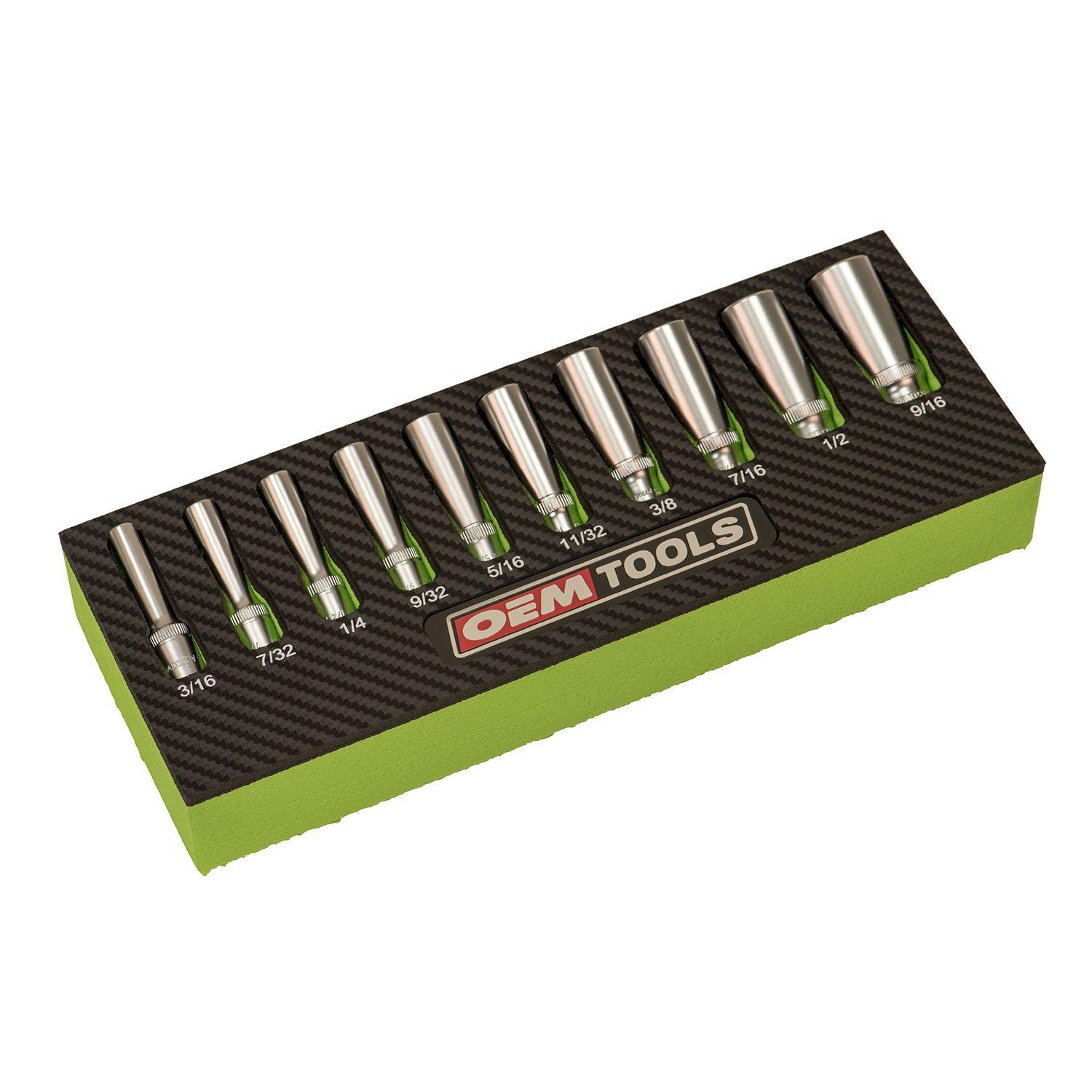 The OEMTOOLS 10 Piece 1/4 Inch Drive Deep Socket Set - SAE includes ten popular SAE sockets. The set comes in an EVA Tray with custom-cut contrast soft foam to keep your tools organized and ready for the next job. Most trays have sizes etched in them for quick and easy identification.