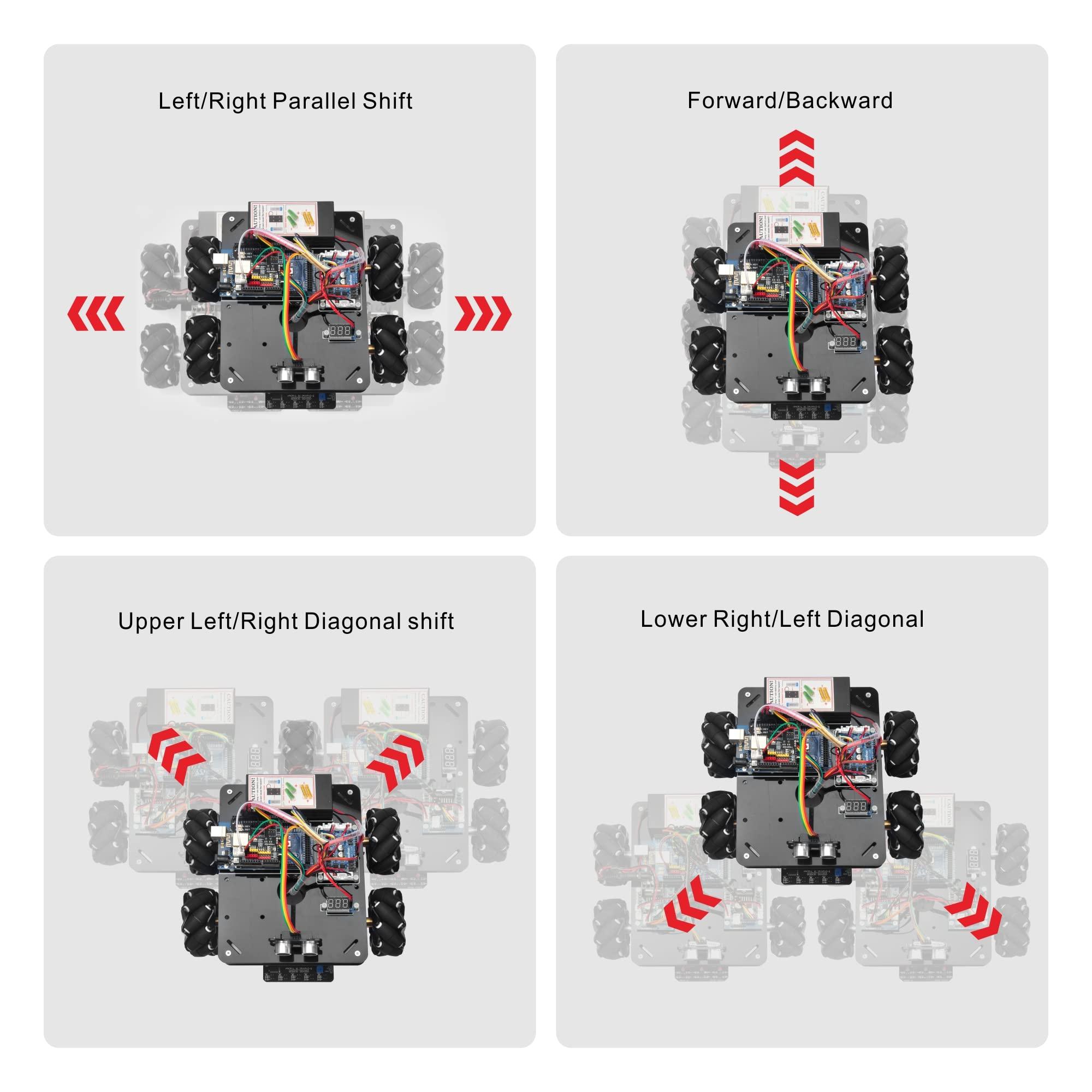 - OMNI WHEELS ROBOT CAR: 4WD Omni-directional wheels and DC Motor robotic car uses the latest mecanum wheels for omnidirectional movement and allow your robotics to not only travel forward and backward, but also sideways and diagonally((Left/Right Parallel Shift,Forward/Backward,Upper Left/Right Diagonal shift,Lower Right/Left Diagonal Shift).Perfect for tight spaces.