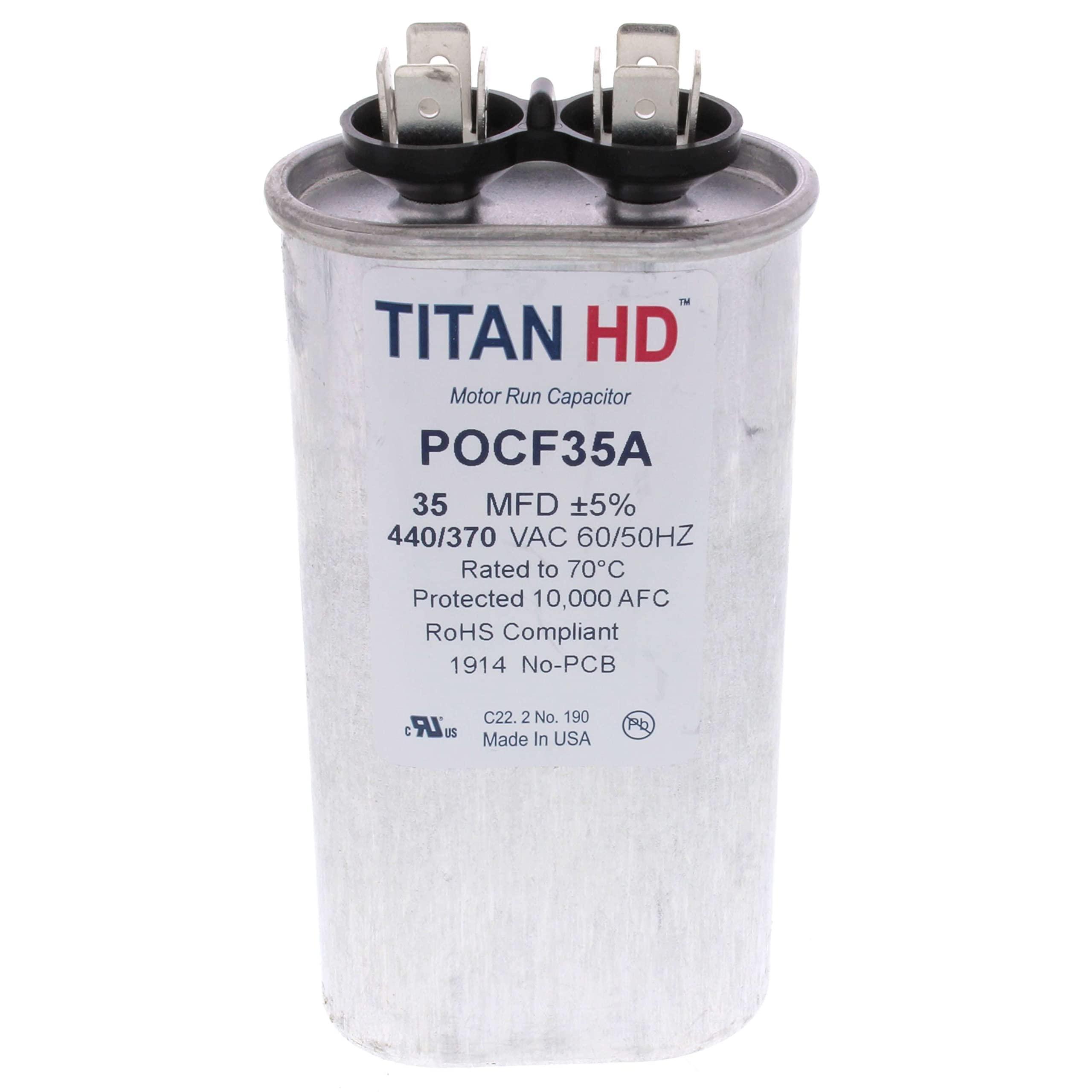 Packard has received the call to create a USA-made capacitor to provide contractors with confidence on the job. Our answer is Titan HD. With a substantial 60,000 hours of operating life, it is just as hardworking as those who made them. Made in USA, Full product offering 234 ratings available!, 60,000 hours operating life, Meets the rigorous EIA-456-A industry standard for performance and quality. Eye-catching packaging for retail environment, Contains metalized polypropylene film technology for self-restoration in the event of a breakdown. Sophisticated UL-approved pressure sensitive interrupter to remove the capacitor from circuit at end of life, Patented, environmentally-friendly oil prevents corrosion and aids in optimum heat transfer. Capacitor Voltage: 440/370, Run MFD: 35, Capacitor Shape: Oval, Brand: Titan HD, Can /Case Size: 4, Country of Origin: USA, Hertz: 50/60, Material: Aluminum Can, Oil Type: Soybean Based, Operating Temperature Range: -40 to 70, Terminals: Standard blade terminals, Tolerance: +/- 5%, UPC: 840899105369, Voltage: 440/370