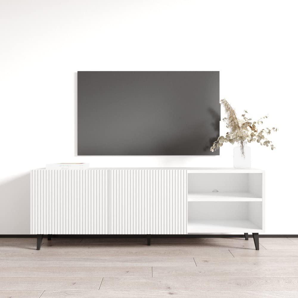 Pafos 59" TV Stand - Modern TV Stand / TV Console / TV Cabinet / Central Entertainment Center Fits up to 65 inch TVs Matte fronts with a matte body Manufactured in and imported from the European Union Modern and unique contemporary design Perfect for those in need of living room storage space Flat packed and ready to ship Dimensions: 20.5 inches height x 58.9 inches width x 15.7 inches depth