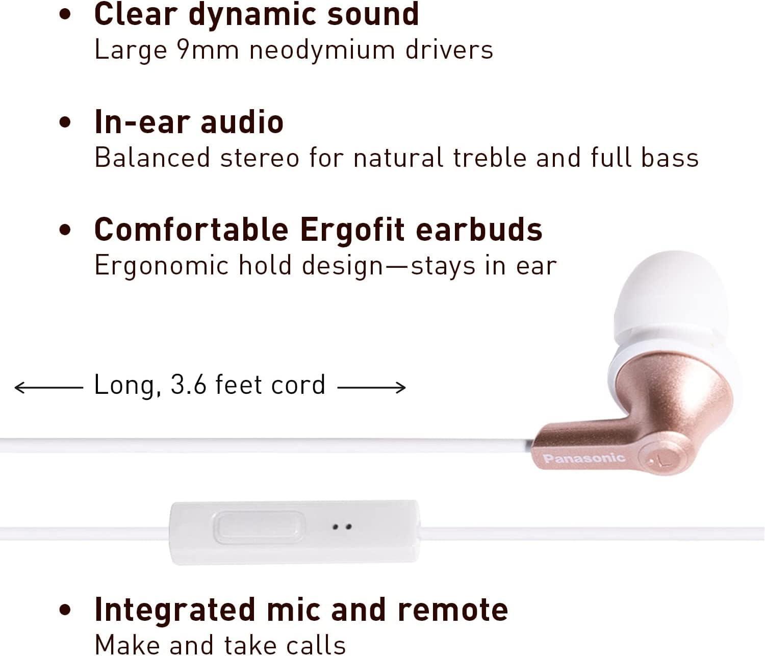 The Panasonic RP-TCM125 ErgoFit Earbud Headphones with Microphone and Call Controller are the perfect combination of style, comfort, functionality and most of all, high-quality sound. The In-line microphone on the cord of earbud headphones is used for answering calls or voice commands; Compatible with iPhone, Android and Blackberry. Earbuds with three sets of earpads (S/M/L included), provide a custom, comfortable ergonomic fit that wont slip out. Choose from eleven (11) vivid color options with color-matching earbuds, headphone cord and call controller to best complement your personal style and mood. Large 9mm drivers with neodymium magnets along with a wide frequency response and smart ergonomic fit earbuds deliver dynamic, crystal-clear sound while helping to keep out unwanted outside noise. Stereo headset tonally balanced audio with crisp highs and deep low notes, plus wider frequency response and lively sound quality for recorded audio. Long, 3. 6-ft headphone cord threads comfortably through clothing and bags making it easy to connect. DID YOU KNOW? You can use your headphones as a microphone! A microphone is the same as a speaker. The diaphragm of the driver of the headphones is moved by the molecules of air that make up a soundwave. This driver is attached to a coil of wire (voice coil) which rests between a magnets. DISCLAIMER: iPhone is a Trademark of Apple, registered in the US and other countries. The Trademark BlackBerry is owned by Research In Motion Limited and is registered in the United States and may be pending or registered in other countries. Panasonic is not endorsed, sponsored, affiliated with or otherwise authorized by Research In Motion Limited. Android is a trademark of Google requires lightning plug adaptor for iPhone 7 and later models (not included). Impedance (Ohm) / 1 kHz - 16