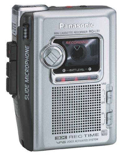 The Panasonic RQ-L31 Portable Cassette Player with Slide Microphone is a compact, handheld microcassette recorder. You'll be able to achieve up to 25 hours of recording with just two AA batteries. This recorder features a valuable voice activation system that helps conserve tape space -- recording begins as soon as sound is detected and stops when there is a lull in conversation so you'll never waste valuable tape. The built-in front speaker makes for easy listening so you can review recordings without headphones.