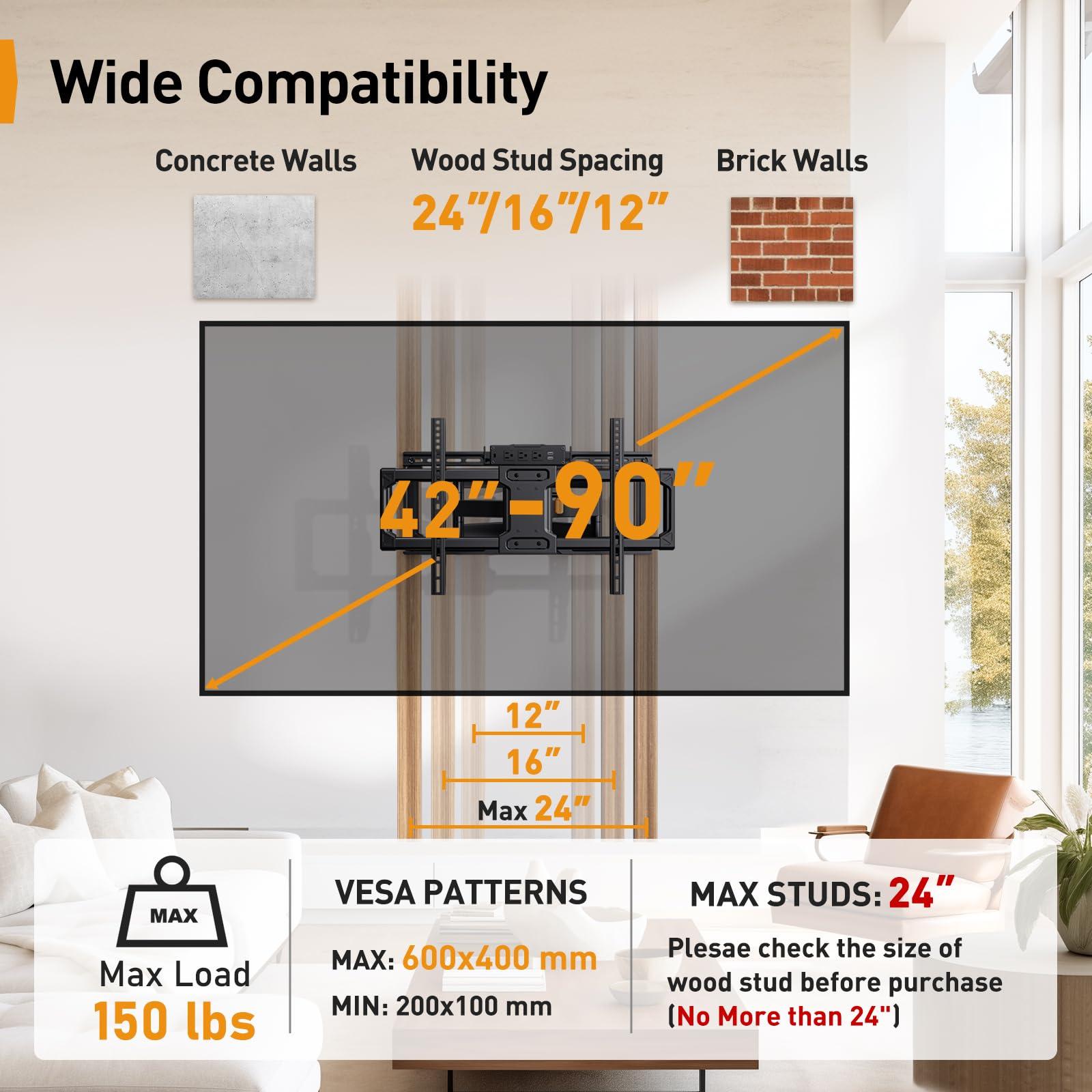 - Wide Compatibility: Our full motion TV wall mount is designed to fit most 42-90 flat or curved TVs with VESA patterns 200x100 to 600x400mm. The 85 inch TV wall mount can be installed on 12/16/24 wood studs or solid concrete walls, and brick walls. Please do not mount on drywall alone.