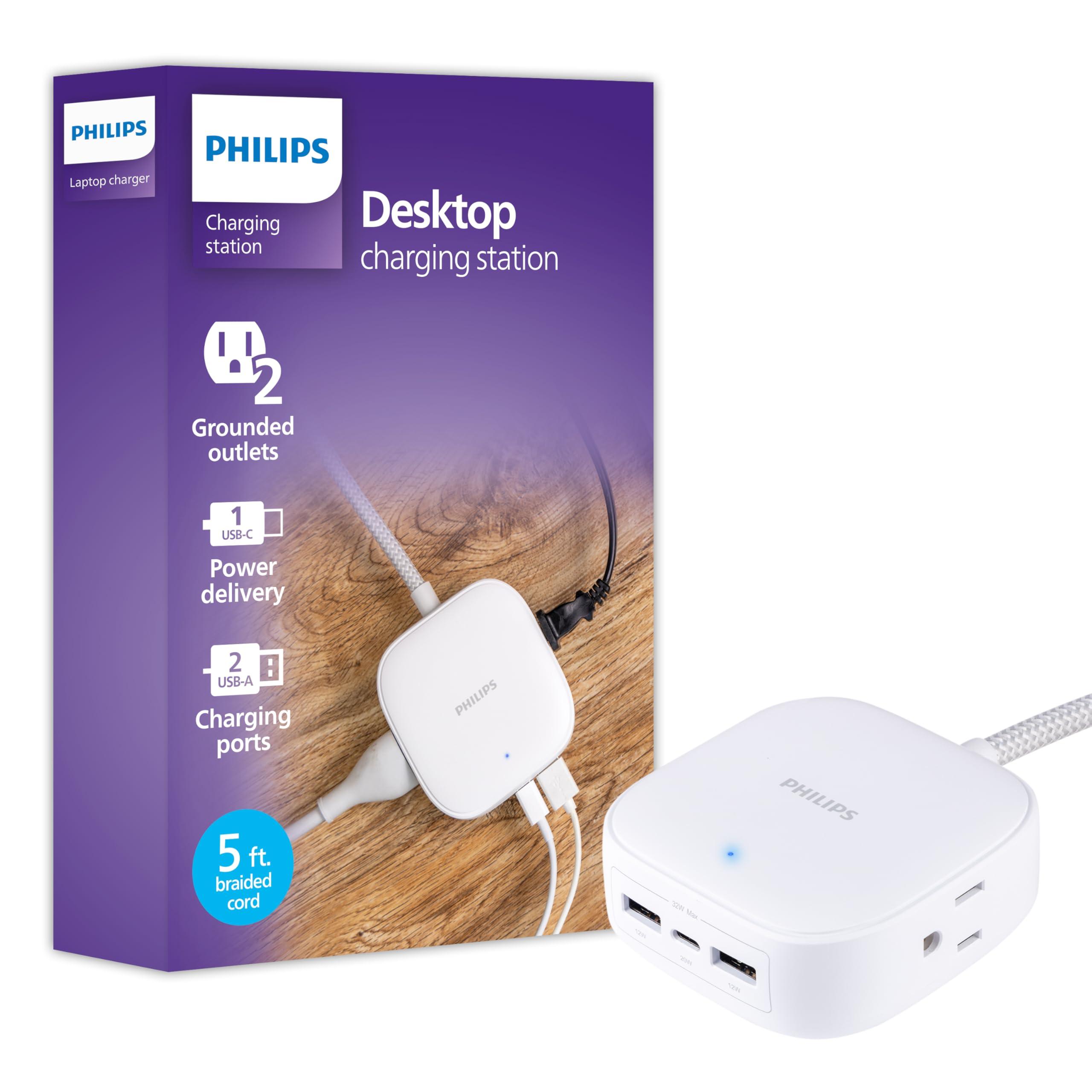 Power and charge your favorite office accessories with the Philips Desktop Charging Hub. Two grounded outlets power your laptop, lamps, printers and more, while one USB-C port and two USB-A ports are perfect for keeping mobile devices charged and ready to go. This compact charging station provides power where you need it most while blending among your desk organizers and accessories without taking up too much desktop real estate.