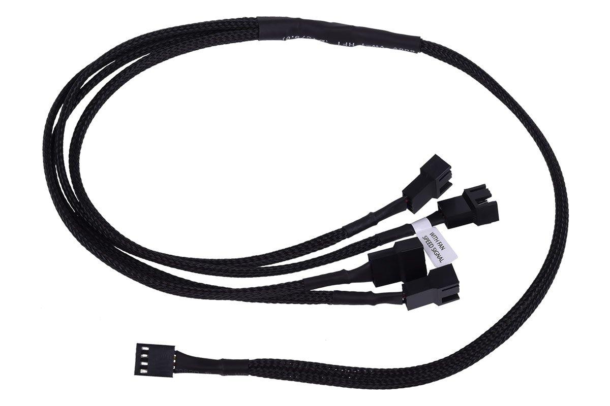 Length: 0.6 m; colour: blackA Y-cable from a 4 pin PWM connector to 4 x 4 pin PWM. Since controlling and switching via the motherboard of PWM fans is much more cost-effective than via fan control, this cable is ideal. This cable can be used to increase the low number of motherboard slots for this type of fan. The adapter comes in a plain black. The cables are shielded with a matching jacket made of Flexsleeves. It provides additional protection against abrasion. This significantly increases the life of the cables. The ends towards the connections have been provided with shrink tubes, so that a clean transition has been created. A white sticker on the cable indicates which is transmitting the speedometer signal. Sleeving: This cable is not only functional, but also visually appealing. The surrounding mesh that wraps the actual cables is very dense and offers exactly the effect that the professional leever want: complete conversion of the cables to emphasise the uniqueness of its system even better! Particular attention was paid to the combination of the cable sheathing (the sleeve), the connector and the heat shrink tubing to give a uniform image. Sets: Phobya's goal is to meet the hobby and professional case modders a little bit. Sleeving is a lot of work and costs a lot of time, so you can now convert your complete system with the cables from Phobya as m