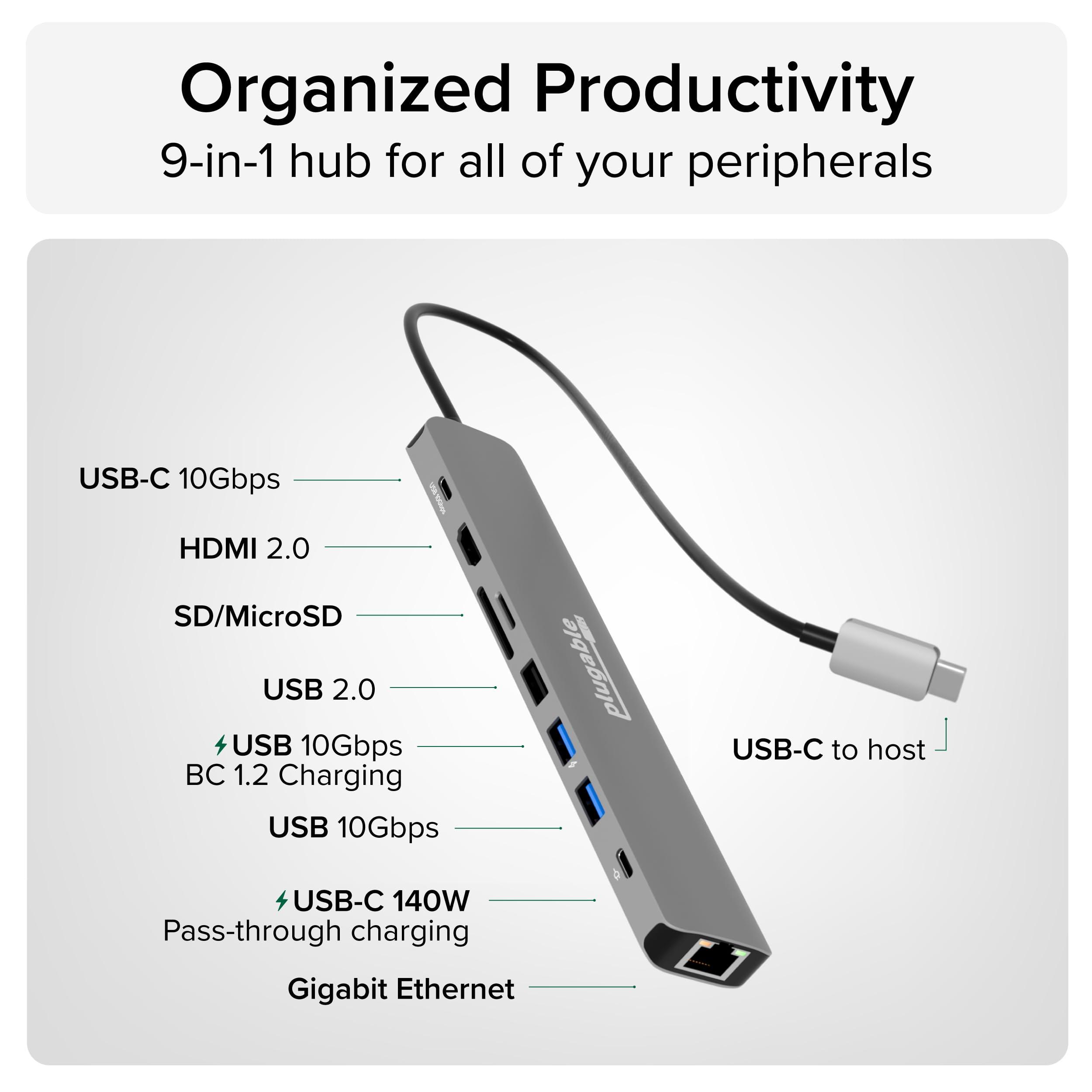 - Why Choose This 9-in-1 Hub: In a cushy office, cramped home office, or on the go, the Plugable USB-C Hub is preferred by productive people for its 4K 60Hz HDMI, 1x 10Gbps USB-C, 1x USB 2.0 port, 2x USB-A 10Gbps ports (one with BC 1.2), SD and MicroSD (UHS-II), Gigabit Ethernet, and most impressive, 140W pass-through charging (thats a lot)