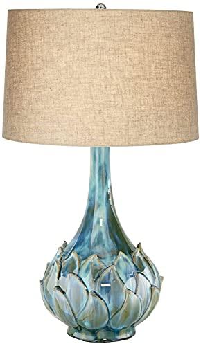 - Pre-Assembled ShadesHand-applied blue green reactive glaze finish over ceramic construction. Please note, because the base is handcrafted, slight variations in color and pattern may occur. Beige linen fabric tapered drum shade. 8-foot long clear cord.