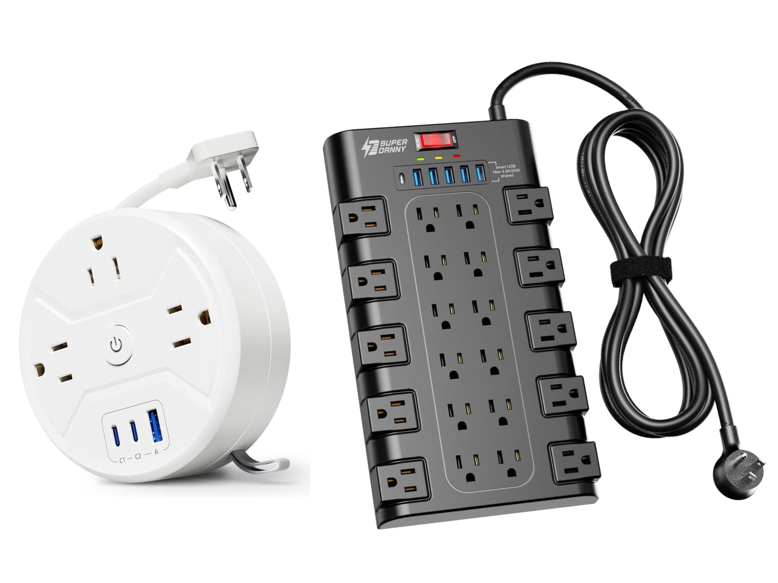 - 28-in-1 Versatile Power Strip FCC, RoHS safety certified, with the extension cord and flat plug certified by UL. Superdanny power strip surge protector has 22 grounded 3-prong outlets and 6 USB ports, providing power for all devices that you need to plug in at one location. Perfect for gaming or media set up, surround sound system, TV, phone, tablet, PC, laptop, gaming computers, lamps, and other devices simultaneously.