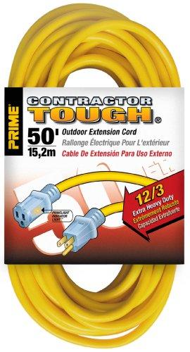 The Prime Wire and Cable EC511830 50-Feet 12/3 SJTW Yellow Jobsite Outdoor Extension Cord with Prime Indicator Light is Water Resistant, Flame Retardant and Ultra Flexible. Nickel-Coated Brass Blades Resist Corrosion and Abrasion Resistant.