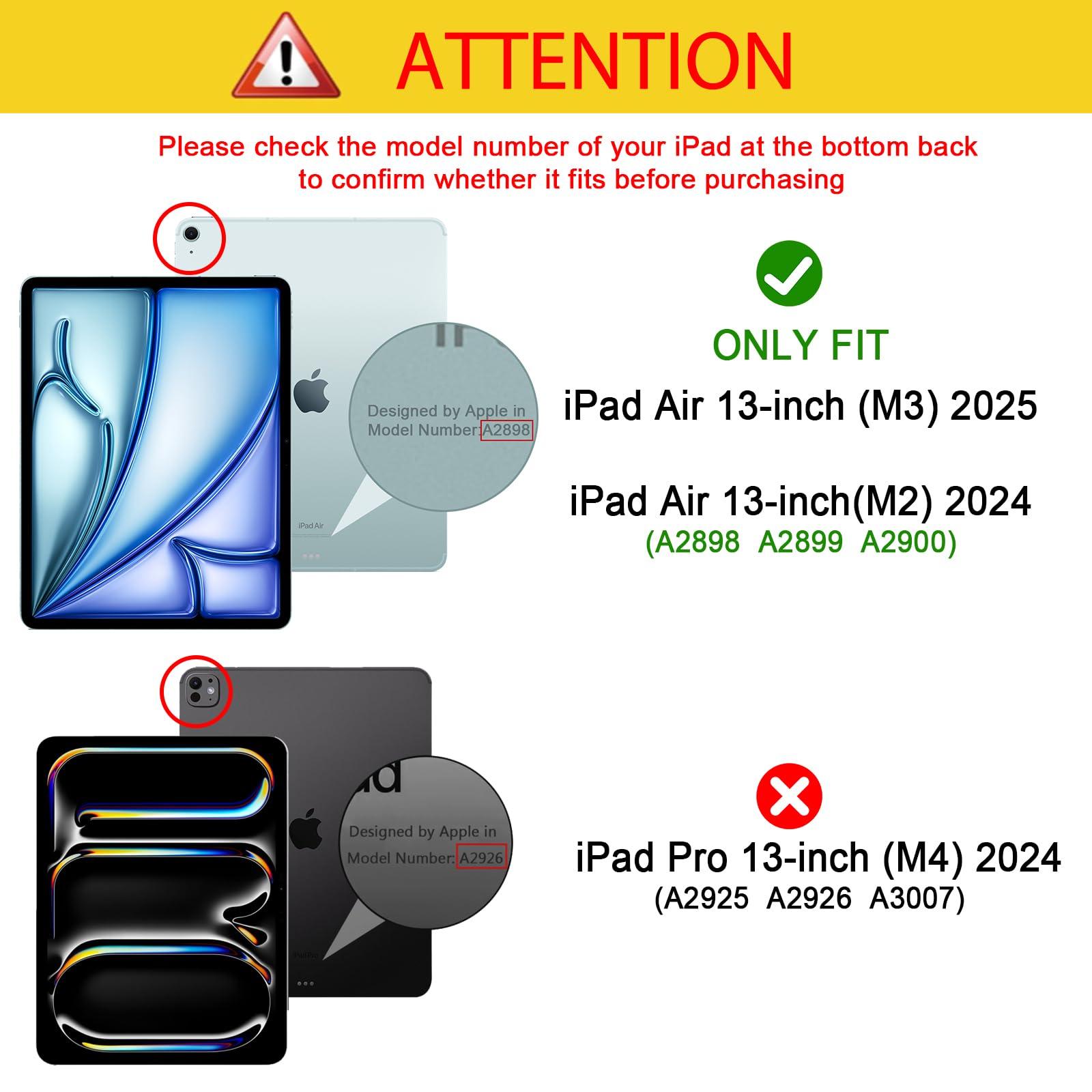 - Only Compatible with iPad Air 13-inch (M3) 2025 Release, iPad Air 13-inch (M2) 2024 Release (Model: A2898 A2899 A2900). Doesn't fit any other iPad models. Please check the model number of your iPad at the bottom back to confirm whether it fits before purchasing