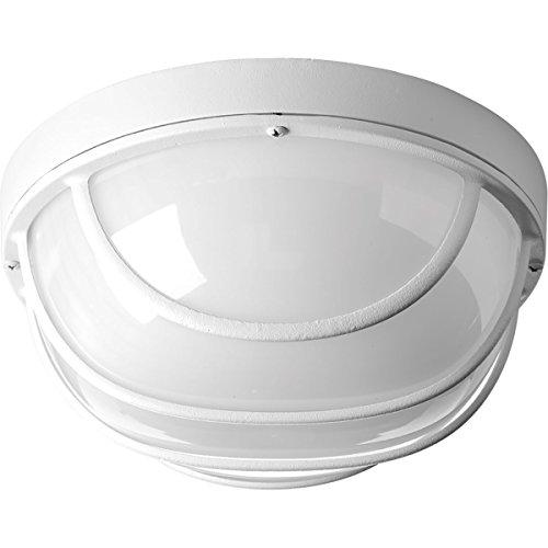 One-Light 9-1/2" LED Wall or Ceiling Bulkhead. General purpose LED luminaire comprised of a die-cast aluminum frame and polycarbonate diffuser with cage design. Fixtures are impact resistant and can be mounted on wall or ceiling. Replaceable LED module. White finish.