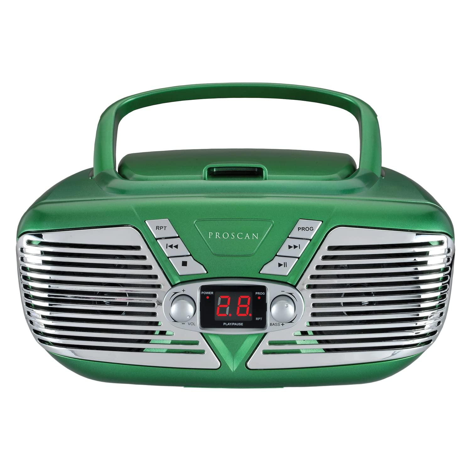 Take this Proscan Green Retro-Style Portable CD Radio Boom Box to school, the beach, or anywhere you go. Youll be able to enjoy any of your favorite throwbacks with the top-loading CD player with LED display or any of your favorite new music with the AM/FM radio. This boom box is extremely lightweight, so you can bring it anywhere with you. Power it with the included AC power cord or with 6 C batteries (sold separately).