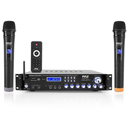 Features: - Home Theater Pro Audio Receiver - High-Powered Hybrid Pre-Amplifier - Multi-Channel Source Audio Selection - Built-in Bluetooth for Wireless Music Streaming - Includes (2) UHF Wireless Handheld Microphones - FM/AM Radio with Digital LCD Display - USB Flash & SD Memory Card Readers - MP3 Audio File Playback Support - Connect & Stream Audio from External Devices - Aux (3.5mm) Input Jack - (2) 1/4 Microphone Inputs - Headphone Jack, 1/4 - RCA (L/R) Audio Input/Output Jacks - Dedicated for Subwoofer Output - Screw-Type Speaker Terminal Binding Posts - Front Panel Button & Rotary Control Center - Independent Audio Source Selection - LED Backlight Illumination with Dimmer Control - Microphone Volume/Echo Control - Integrated Overload & Short Circuitry Protection - Built-in Cooling Fan - Universal Rack Mount Design Bluetooth Connectivity: - Built-in Receiver for Wireless Audio Music Streaming - Simple & Hassle-Free Pairing - Works with All of Todays Latest Devices - (Smartphones, Tablets, Laptops, Computers, etc.) - Bluetooth Version: 5.0 - Bluetooth Network Name: PYLE PRO - Wireless Range: 40+ ft. Whats in the Box: - Hybrid Pre-Amplifier - (2) UHF Wireless Handheld Microphones - Detachable Rack-Mount Brackets - FM/AM Antenna/Bluetooth Antenna - Remote Control - Power Cable Technical Specs: - Power Output: 3000 Watt MAX - 900 Watt @ 2 Ohm - 450 Watt @ 4 Ohm - 300 Watt @ 8 Ohm - S/N Ratio: >76dB - T.H.D.: <1% - Radio Station Memory Presets: 30 - Digital Media File Playback Support: MP3/WMA/WAV/FLAC/APE - Maximum USB/SD Flash Memory Support: Up to 64GB - Battery Operated Remote, Requires (2) x AAA Batteries, Not Included - Battery Operated Mic, Requires (2) x AAA Batteries Each, Not Included - Power Cord Length: 4.5 ft. - Power Supply: 130/230V, Switchable - Unit Dimensions (L x W x H): 19.0 x 12.0 x 3.1 inches. SAFETY INSTRUCTIONS : (1) Make sure that all connections are properly connected and the main volume is set to minimum level before turning ON the unit. (2) When more than one pair of speakers are used, (specially the main speaker output) make sure that the speakers used are of the same wattage and impedance, otherwise the unit maybe damaged under high power or long term operation. (3) To avoid humming sounds and unwanted noise, make sure that all the wires are properly inserted. (4) For speaker cords, strip off the vinyl coating and twist the wire tip.Push down the pink jack or loosen the screw terminal, before inserting the wire tip, then fasten it and tighten the screw. Be careful not to let the wires stick out of the terminal otherwise this may cause a short circuit when wires of different terminal contact each other. (5) After the unit is turned ON, adjust the main volume to the desired level same with the bass and treble volume, etc.
