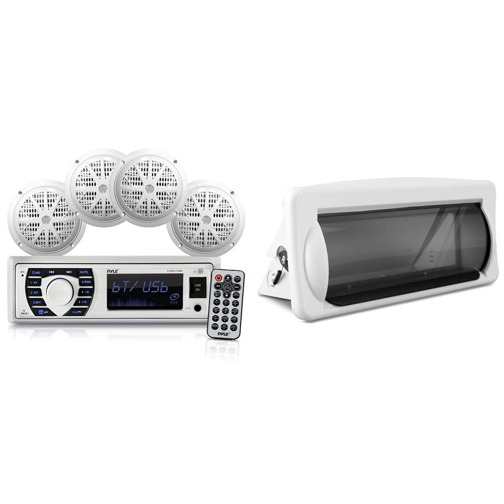 Pyle Model : PLMRKT38W Boating & Marine Stereo & Speaker Kit Bluetooth Marine Stereo Receiver & Speaker System Kit, HandsFree Calling, Wireless Streaming, MP3/USB/SD Readers, AM/FM Radio, (4) 6.5 Waterproof Speakers (White) System Features: Kit Includes Receiver + (4) Marine Speakers + Accessories InDash Console Marine Stereo System Bluetooth Wireless Music Streaming Builtin Microphone for HandsFree Talking USB Flash Drive & Micro SD Memory Card Readers Aux (3.5mm) Input Connector Jack Ability to Connect Additional External Devices (Smartphones, MP3 Players, Tablets) Rear RCA (L/R) Output Connector Jacks Illuminated Button Controls LCD Digital Display Panel ID3 Tag Song Readout Information: Name, Title & Artist Repeat/Random Music Functions Bass, Treble, Balance, Fader Adjustment EQ Audio Configuration Used for Automobile, OffRoad, Boat & Marine Watercraft