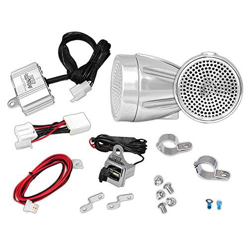 Mounting hardware (clamps, bolts, plate, brackets), 5 volt USB charger, 12 volt tap, 12 volt power/audio interface wire and handlebar mount rotary volume control. Additional Features 12 Volt T-TAP 2 Channel Micro Amplifier Chrome Bullet-Style Cabinets USB Charger & Satellite 5V Plug 600 Watts Maximum Power Output Full Range Water Resistant Construction Speaker Dimensions : 2.5''(W) x 2.5''(H) x 3''(L) Amplifier Dimensions : 3.25''(W) x 1.25''(H) x 2''(L) Chrome Stainless Universal Handlebar Audio Mount About Pyle