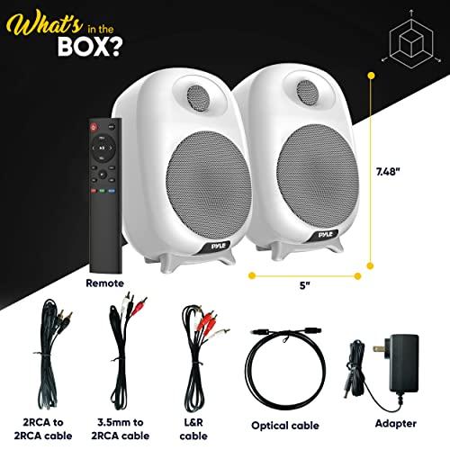 - SPEAKER DIMENSIONS: These Hi-Fi bookshelf monitor speakers measure (L x W x H): 6.1'' x 6.1'' x 9'' -inches (each) and comes complete with (1) US adapter, (1) optical cable, (1) L&R connection wire, (1) remote control, and (1) 3.5mm to 2 RCA cable.