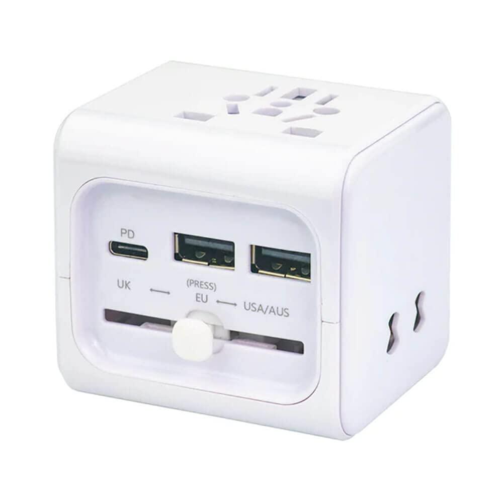 A necessity for every traveler. This compact, allinone design global power adapter works with 180 countries and territories. With 3 USB charging ports 4 major power plug types, it is ready charge your electronic devices around the world including tablets, smart phones, GPS, speakers and other USB devices. It has safety shutter to prevent accidental contacts and made of high impact durable plastic case. Note Make sure the power supply being used supports the countries voltage rating. Features. Compact global power adapter. USB autoallocate intelligent chipset. USBC fast charger with PD. Dual USBA 2.1Amp Shared Ports. USB overcurrent power protection. Recharge any iOS Android devices. Safety shutters prevent accidental contacts. Fits wall outlet with on off switchSpecifications. Connectors US/AU, UK, EU. Spec Rating 100V 250V 50/60Hz 6A. Output AC 1500Watts, USB 28Watts USBC with PD 5v2A / 9v2A / 12v1.5A. Dual USBA Shared 5v2.1A. Weight 0.3 lbs