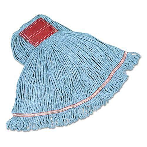 The Rubbermaid Commercial Swinger Loop Wet Mop is a looped-end, tailbanded mop that features a blend of post-industrial cotton and synthetic fibers for higher absorbency and more launderings than cotton mops, and with looped ends and a woven tailband to reduce tangling and fraying for better performance. The floor mops headband is a PVC-coated mesh that resists moisture retention and chemicals. Blue cleaning equipment is recognized in the industry as color-coded for general purpose cleaning in low-risk areas as part of a zone isolation system to help minimize cross-contamination. Launderable up to 50 times. Head Type: Wet Mop; Application: Floor Maintenance; Mop Head Style: Looped End; Mop Head Size: Large.