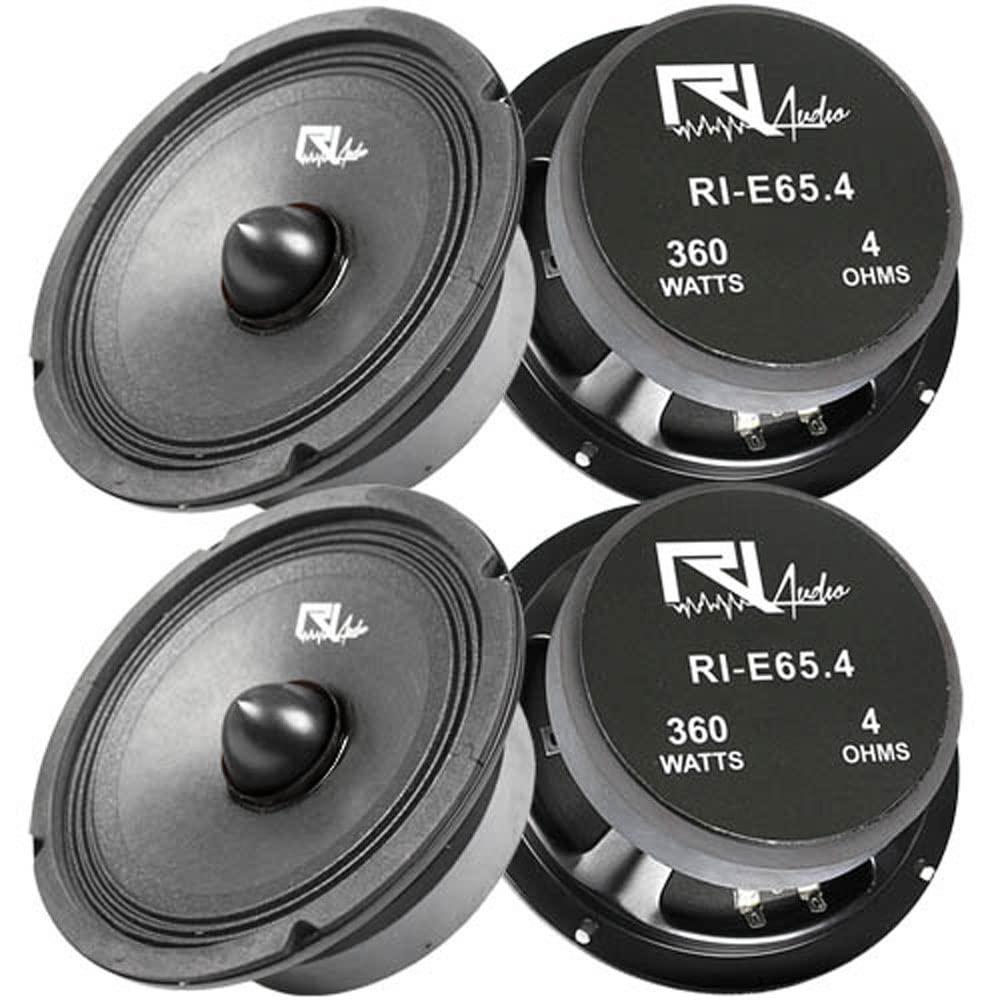 RI Audio 6.5" Midrange Speakers 4 Ohm Power Series RI-E65.4 4 Pack Harness the performance of the new Power Series Midrange Speaker from RI Audio. With ultimate production and value in mind, the creation of the power series was born. These 6.5" Midrange Speakers have an incredible true 180 Watt RMS power handling. Featuring an accordion style surround, 1.5" voice coil, and a 30 oz ferrite magnet, these speakers will give you the clarity and sound quality you deserve for any system you build. Specifications Hybrid spider with interlaced tinsel leads Tradition spade style terminals Stamped steel basket Non pressed paper cone Nominal Diameter: 6.5" 4 Ohm impedance Program power:180 Watts RMS Peak power handling: 360 Watts Max 1.5" Voice coil Frequency Response: 120-6000Khz Sensitivity: 96 Db Spl Voice coil wire: CCAW 30 Oz Ferrite Magnet Mounting Depth: 2 1/8" Overall Mounting Depth: 2 1/2" Mounting Diameter: 5 5/8" Overall Diameter: 6.5" Magnet Diameter: 4 3/4" *This listing is for Four RI Audio Midrange Speaker*