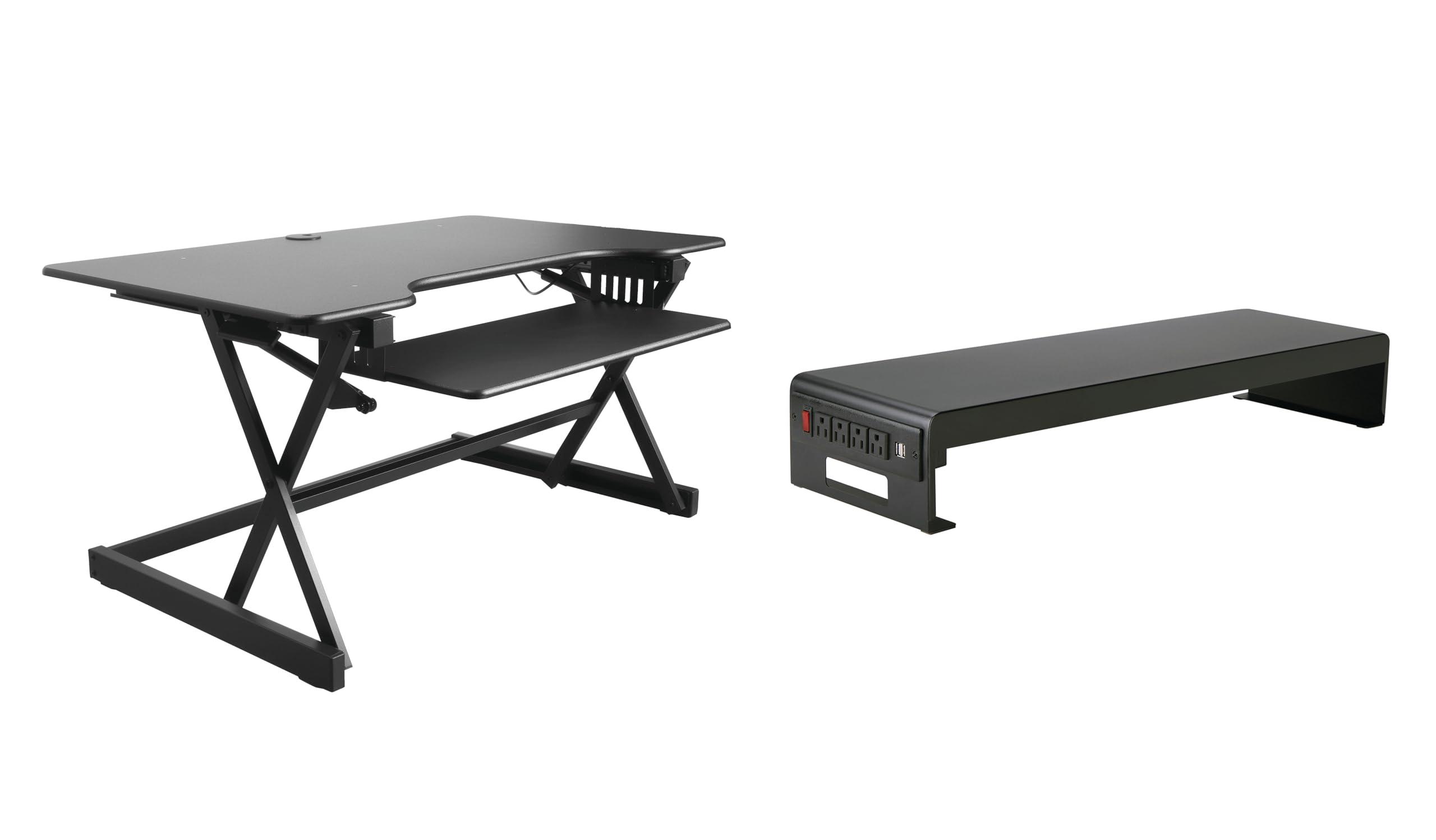 - Standing Desk Bundle includes 40" desk riser (R DADRB-40-ACUSB) and Dual Monitor Stand (R DMS) which holds two standard size or one large monitor and also includes four UL approved AC outlets and two USB 2.0 charging ports.