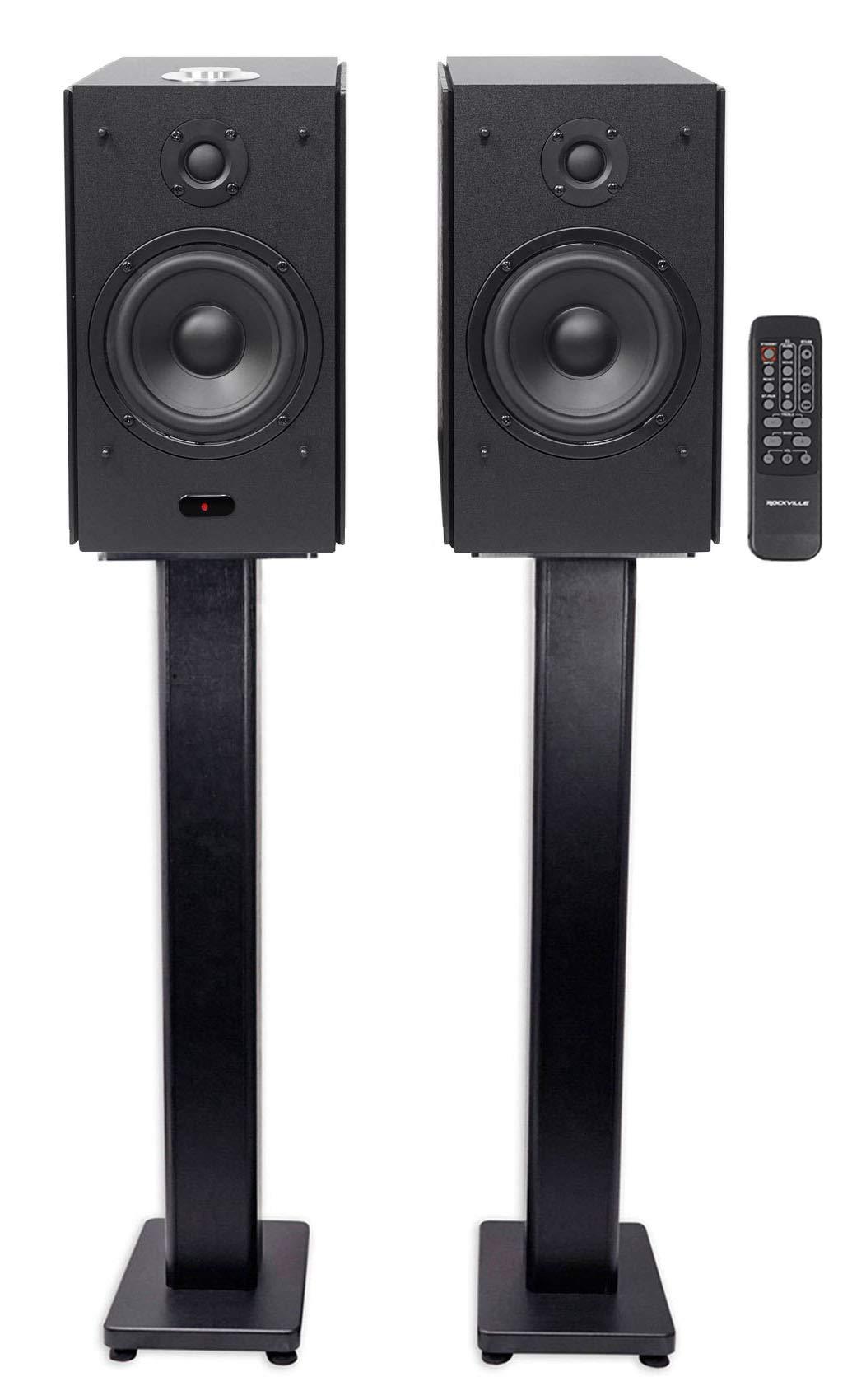 - Package Includes: (1) Pair of Rockville HD5B 5" 150w RMS Powered Bluetooth Bookshelf Home Theater Speakers. (1) Pair of Rockville RHTSB 36" Inch Bookshelf Speaker Stands Surround Sound Home Theater. Includes: (2) speakers. Remote control. (2) batteries. RCA to AUX cable. Owners manual. Warranty card. Features: Rockville HD5B 5" 150 Watt RMS Powered Bookshelf Home Theater Speakers - In Black. 5 Woofer and 0.75 inch tweeter in each speaker
