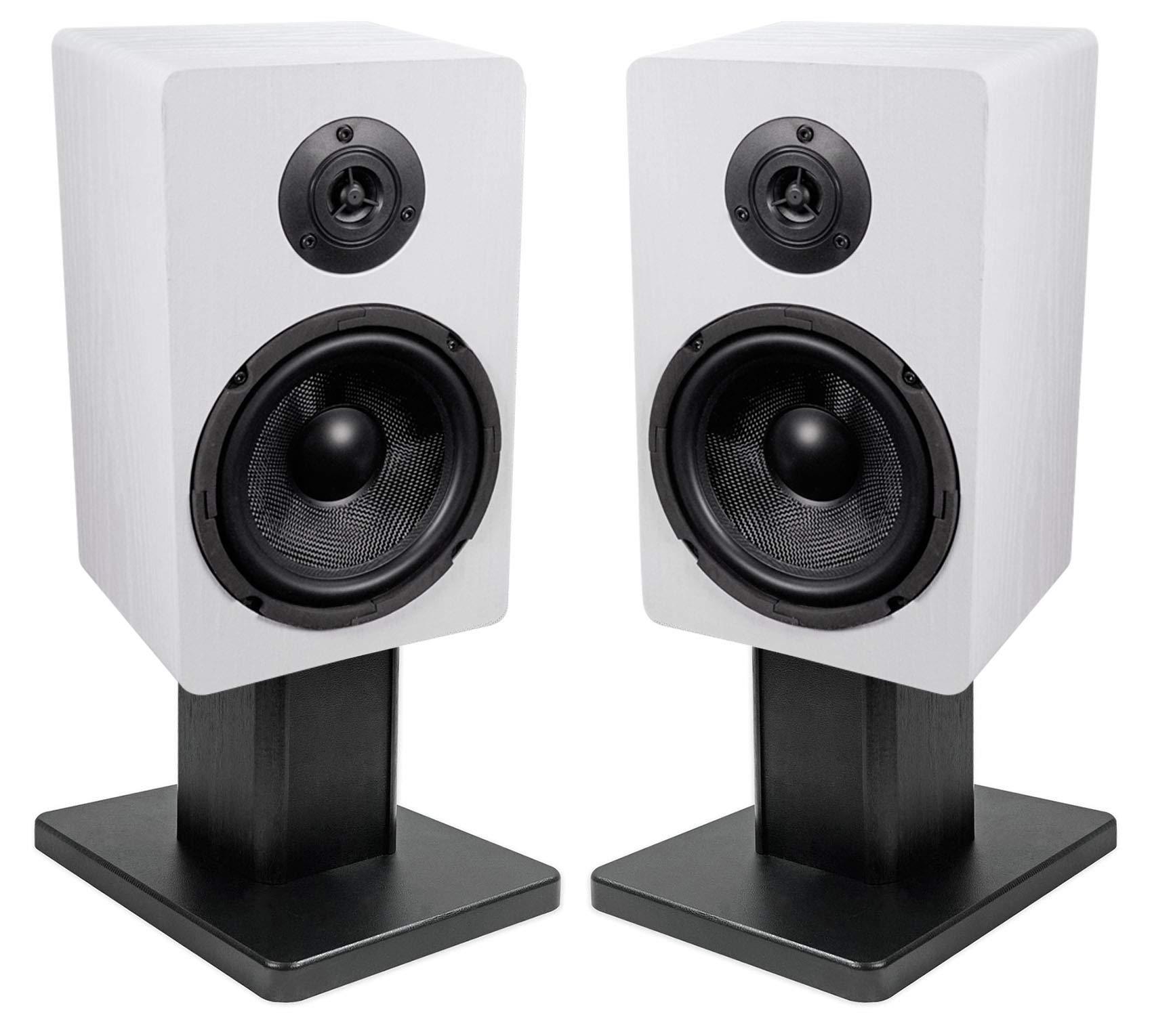 - Package Includes: (1) Pair of RockvilIe RockShelf 64W 400w White 6.5" Home Theater Bookshelf Speakers/4 Ohm. (1) Pair of RockvilIe RHT8B Computer/Bookshelf Desktop Speaker/Studio Monitor Stands-Black. Includes: 8 Isolation pads. 4 Cable clips. 4 Cable ties. 16 Screws. Features: 2 RockvilIe RHT8B Computer/Bookshelf Desktop Speaker/Studio Monitor Stands-Black. Finished with premium furniture-grade paint that will not crack, chip, or peel.