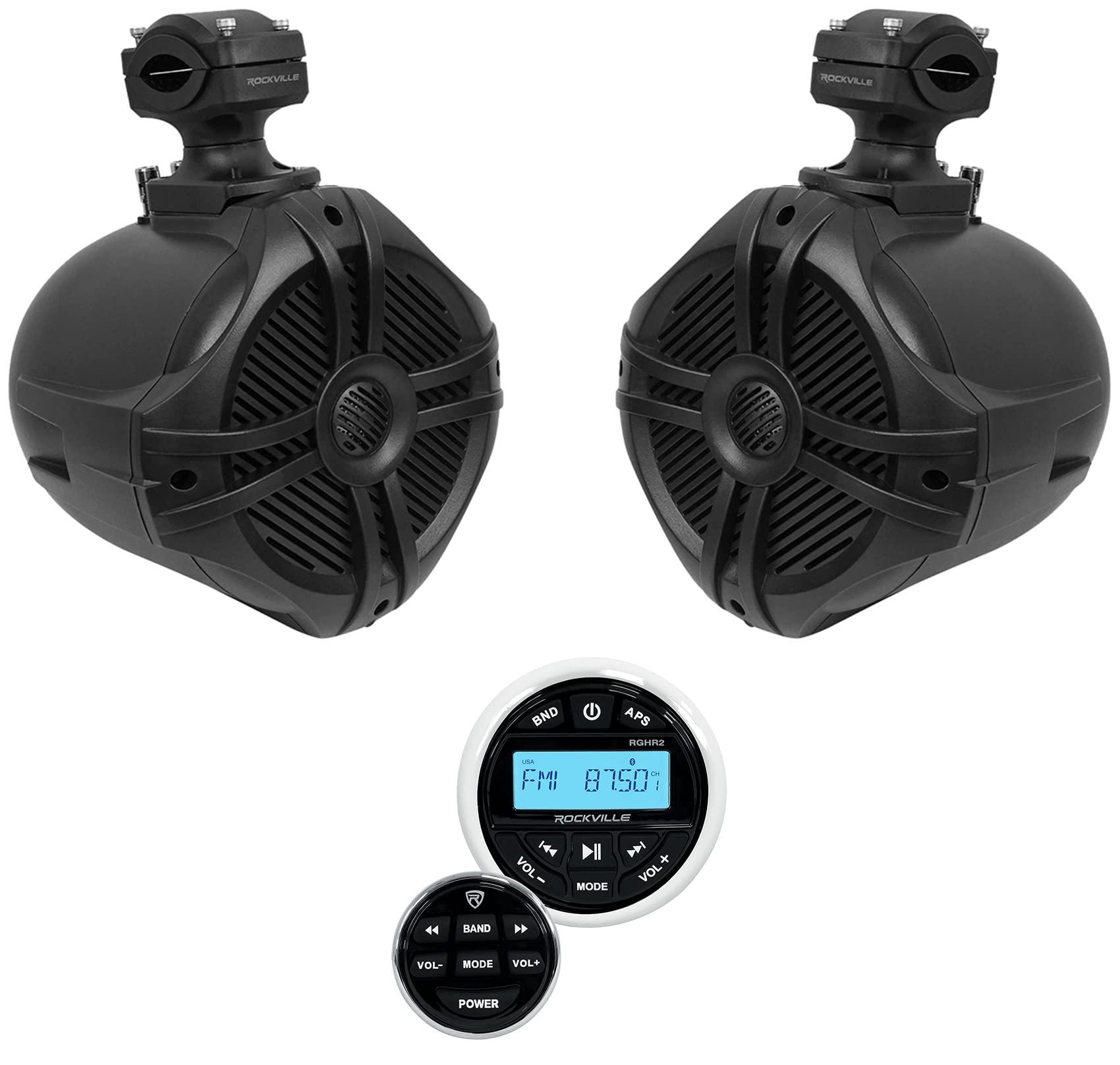- Package Includes: (1) Pair Rockville RWB70B Black 6.5" 250w Marine Wakeboard 360 Swivel Tower Speakers. (1) Rockville RGHR2 Marine Gauge Hole Receiver w Bluetooth USB, Radio + Wired Remote