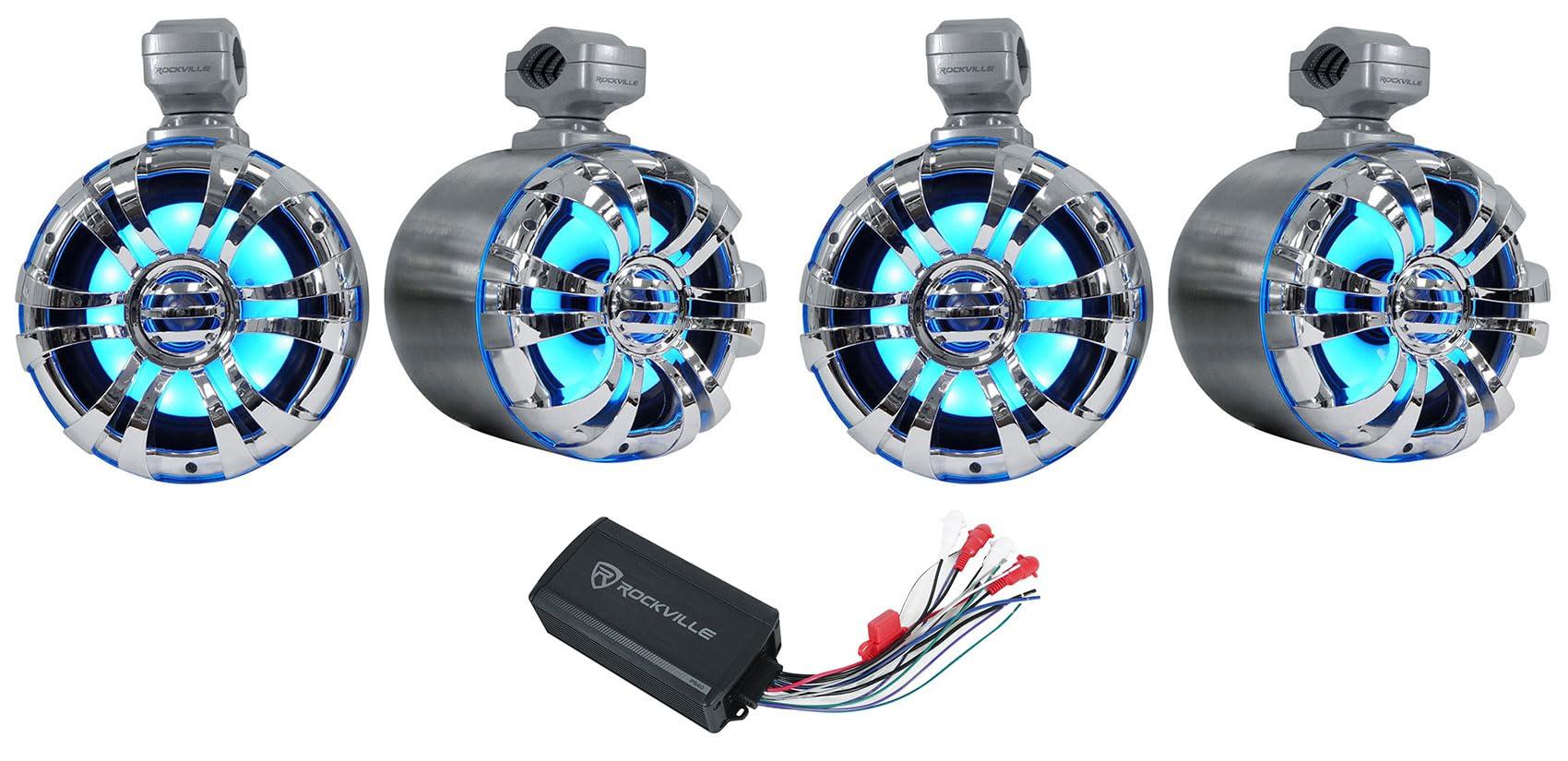 - Package Includes: (2) (2) Rockville WB65KLS Silver 6.5" 300w Metal Marine Wakeboard LED Tower Speakers. (1) Rockville PS40 4 Channel ATV/UTV/Motorcycle Bluetooth Amplifier IP65 Micro Amp. What's in the Box: Pair 6.5" marine wakeboard tower speakers with built in LED's. Mounting brackets and mounting hardware. Remote. Installation hardware. Rockville setup video to guide you through installation and usage. Features: