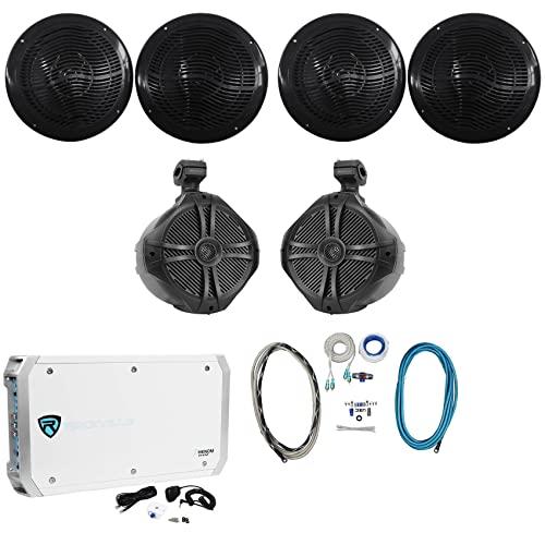 - Package Includes: (2) Pair Rockville RMC80B 8" 800 Watt Waterproof Marine Boat Speakers 2-Way Black. (1) Rockville RMWK4 4 AWG Gauge Waterproof Marine Amplifier/Amp Install Wire Kit. (1) Pair Rockville RWB90B Black 8" 300w Marine Wakeboard 360 Swivel Tower Speakers. (1) Rockville RXM-S6 Marine/Boat 6 Channel Amplifier 2600 Watt Peak / 660w Dyno-Certified RMS