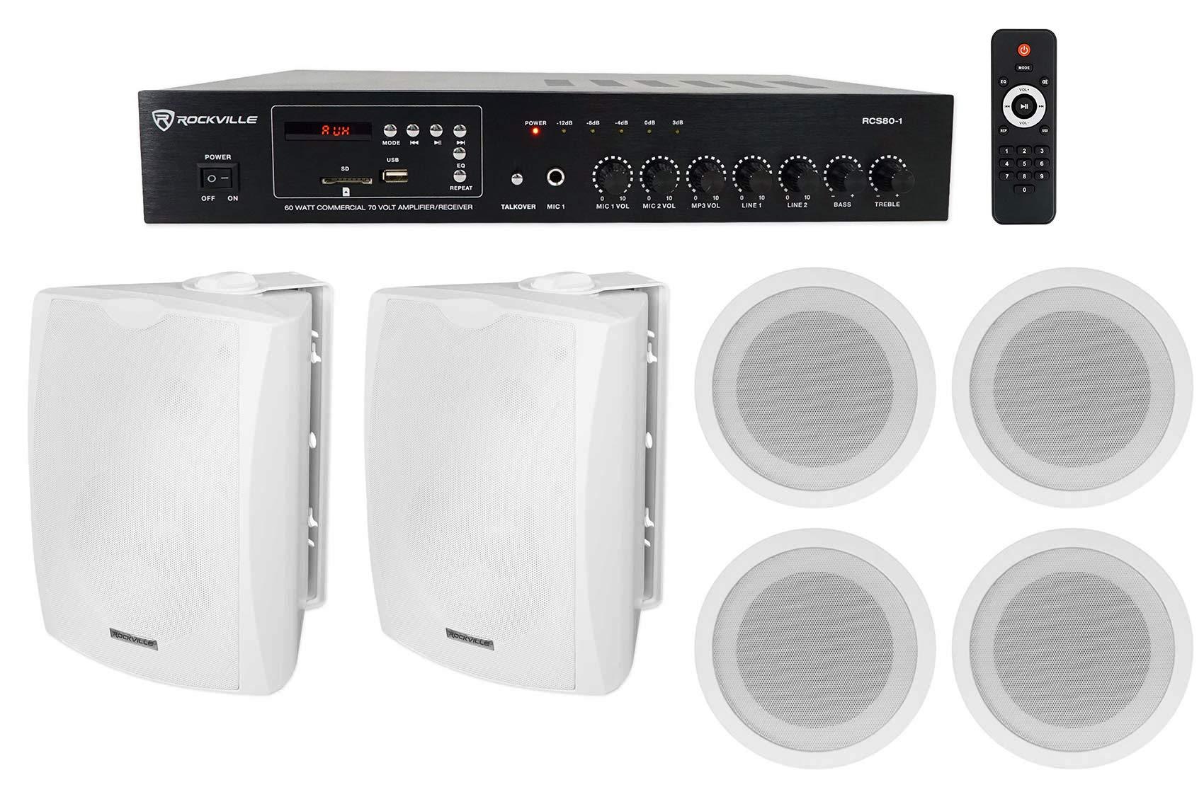 - Package Includes: (1) RockvilIe RCS80-1 60 Watt 70v Commercial/Restaurant Amplifier/Bluetooth Receiver. (2) RockvilIe WET-5W 70V 5.25" IPX55 Commercial Indoor/Outdoor Wall Speakers - White. (1) Pairs of RockvilIe CCL5T White 70V 5" Commercial Ceiling Speakers 4 Restaurant/Office. Amplifier. Remote. Rack mount ears. Power Cable. FM Radio antenna. Owners manual. Warranty. Restaurant. Bar. Caf. School. Conference room. Lounge.