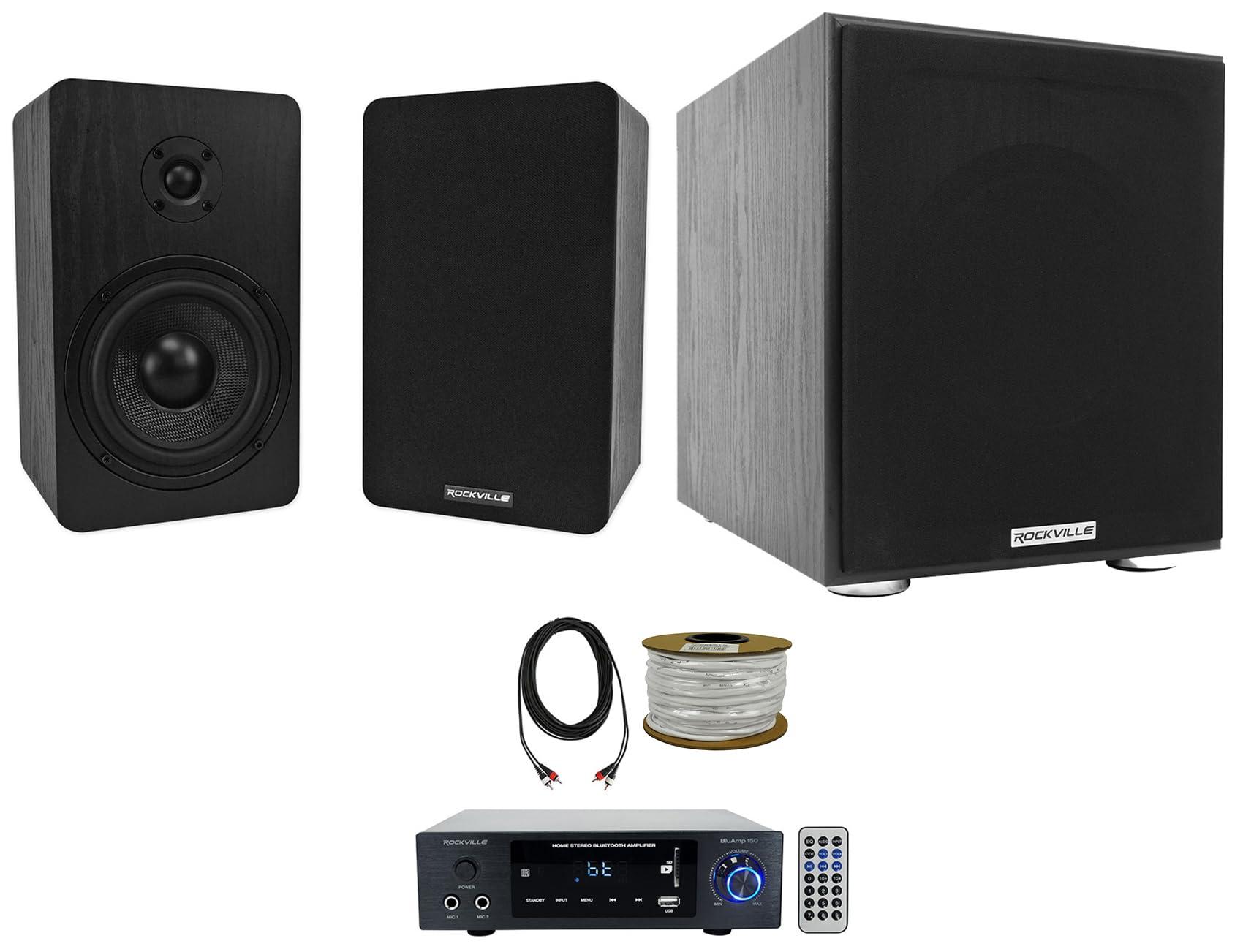 - Package Includes: (1) Rockville BLUAMP 150 Home Stereo Bluetooth Amplifier Receiver Optical/Phono/RCA. (1) Rockville RCC14-100-2 CL2 Rated 14 AWG 100' CCA Speaker Wire In Wall Ceiling 70V. (1) Rockville Rock Shaker 8" Inch Black 400w Powered Home Theater Subwoofer Sub. (1) Rockville RCDR25B 25' Ft. Dual RCA to Dual RCA Pro Audio Cable 100% Copper. (1) Pair of Rockville RockShelf 54B 360w Black 5.25" Home Theater Bookshelf Speakers/4 Ohm