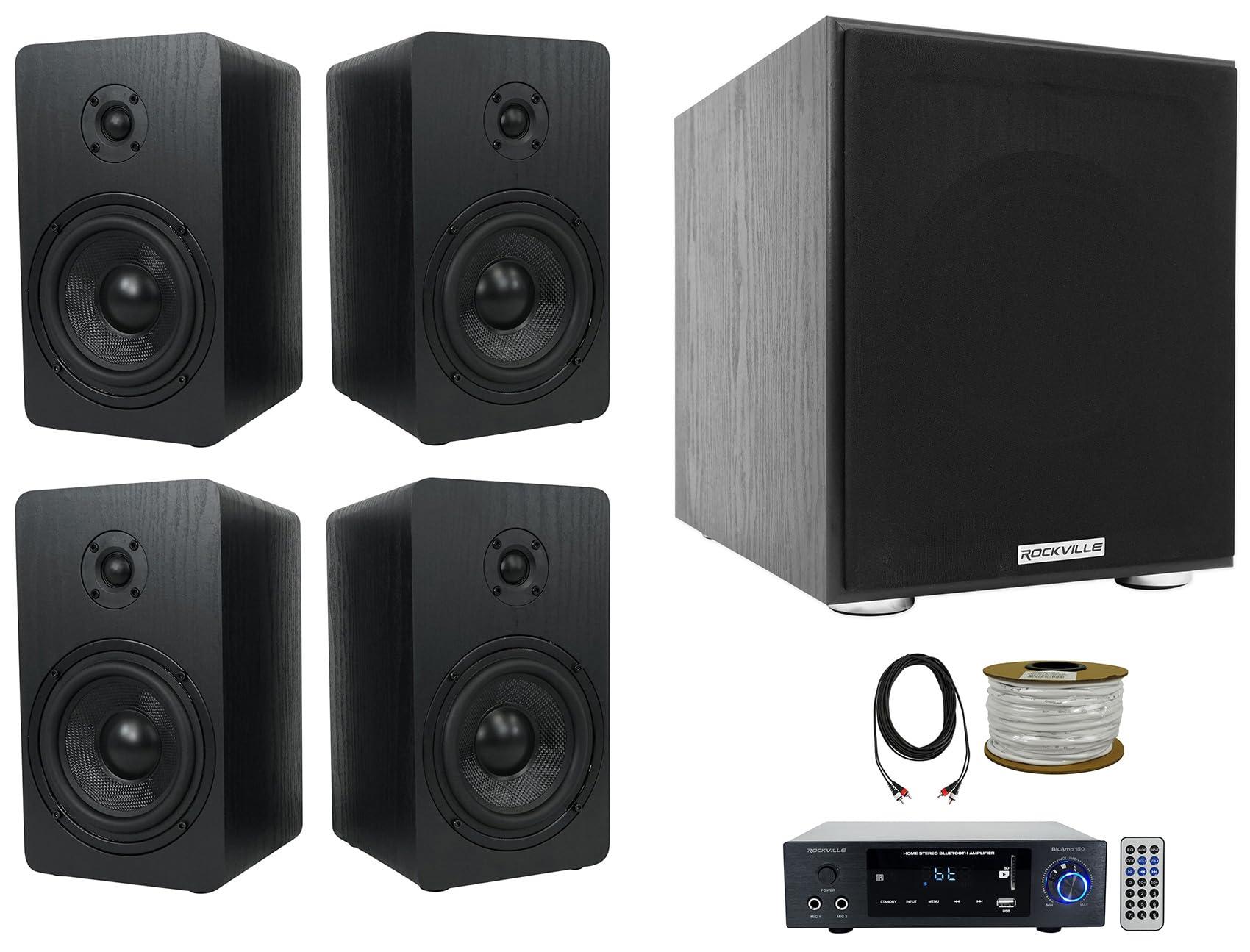 Rockville Rockville BLUAMP 150 Bluetooth Amplifier Bundle with (4) Rockville RockShelf 68B Speakers, Rockville BLUE 14G50 OFC Speaker Wire, Rockville Rock Shaker 8" Subwoofer & Rockville RCDR25B Cable (5 Items)