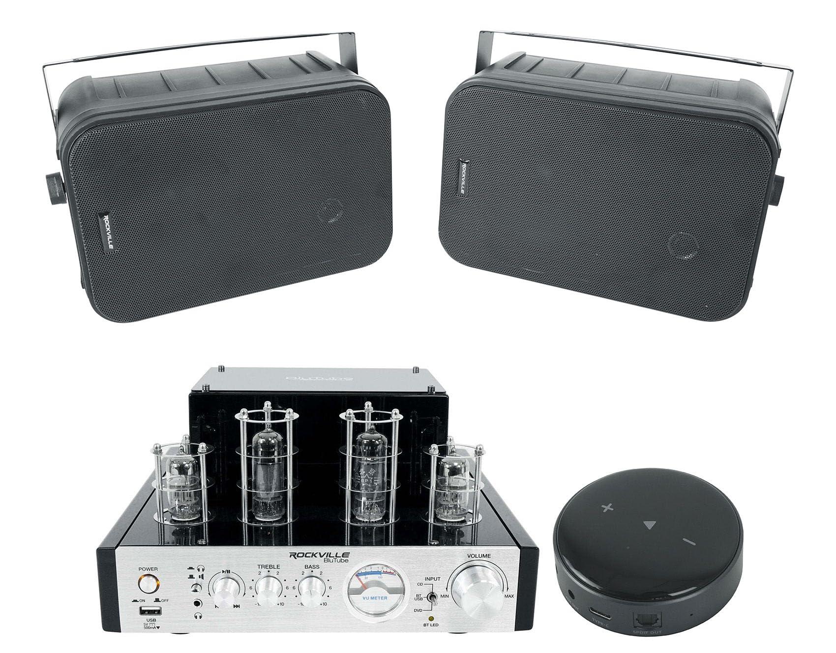- Package Includes: (1) Rockville BluTube 70w Tube Amplifier/Home Theater Stereo Receiver w/ Bluetooth, (1) 2 Rockville HP65S-8 Black 6.5" Indoor/Outdoor Swivel Home Theater Speakers 8-ohm, (1) Rockville Mini Wifi Music Player Wireless Audio Streaming Multiroom Stereo Receiver