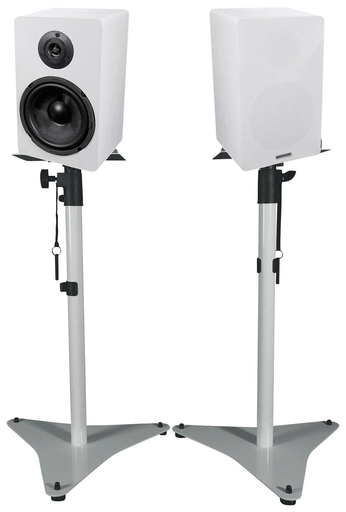 - Package Includes: (1) Pair Rockville RockShelf 64W 400w White 6.5" Home Theater Bookshelf Speakers/4 Ohm. (1) Pair Rockville RVSM5 White Adjustable Studio Monitor Bookshelf Speaker Stands. Includes: 2 stands. 2 sets of rubber feet for hard surfaces. 2 sets of spikes for carpet floor. Adjustable speaker shelf. Hex key (assembly is just 2 screws) Cable clips.