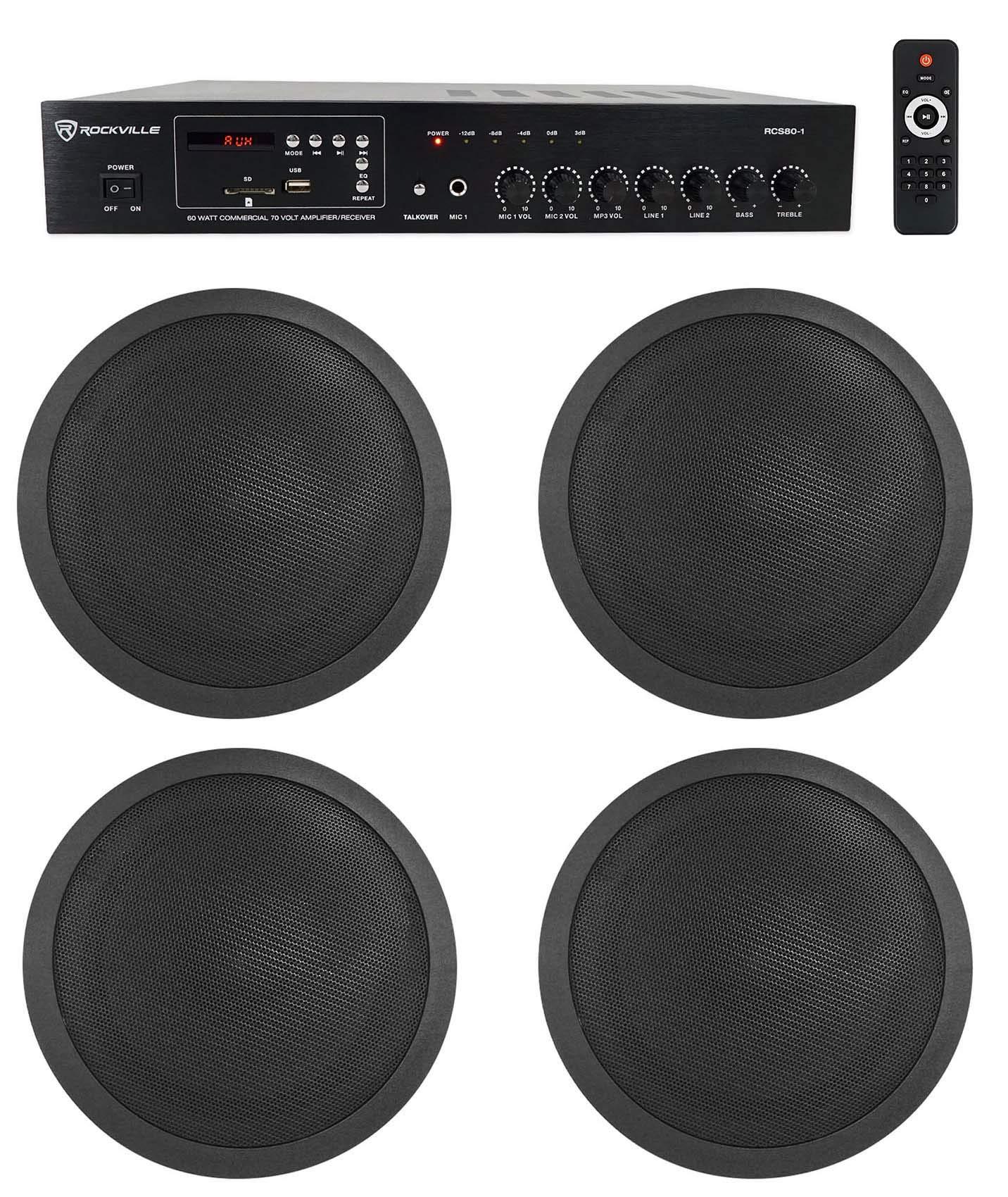 - (1)RockvilIe RCS80-1 60 Watt 70v Commercial/Restaurant Amplifier/Bluetooth Receiver. (4)RockvilIe CCL5T Black 70V 5" Commercial Ceiling Speakers for Restaurant/Office. Includes: Amplifier. Remote. Rack mount ears. Power Cable. FM Radio antenna. Owners manual. Warranty. Applications: Restaurant. Bar. Caf. School. Conference room. Lounge. Features: RockvilIe RCS80-1 60 Watt Commercial/Restaurant Amplifier 19" Rack-Mountable (Removable Rack Brackets) Digital Hybrid Amplifier/Receiver